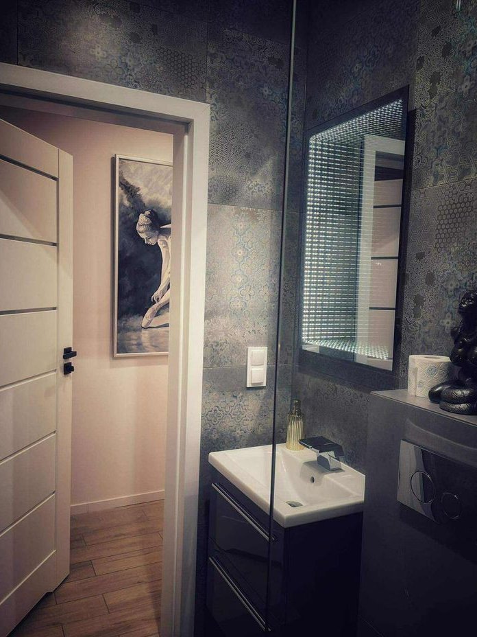 Salon z Jadalnią: Przestronny (33,24 m²), z kominkiem i bezpośrednim wyjściem na taras. Na podłodze terakota imitująca drewno.