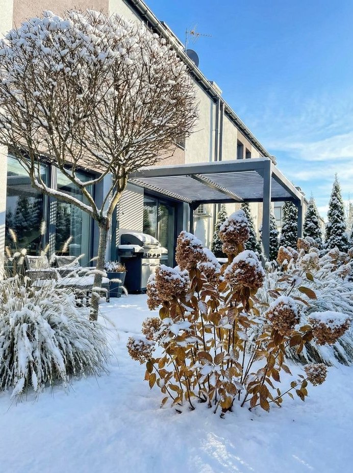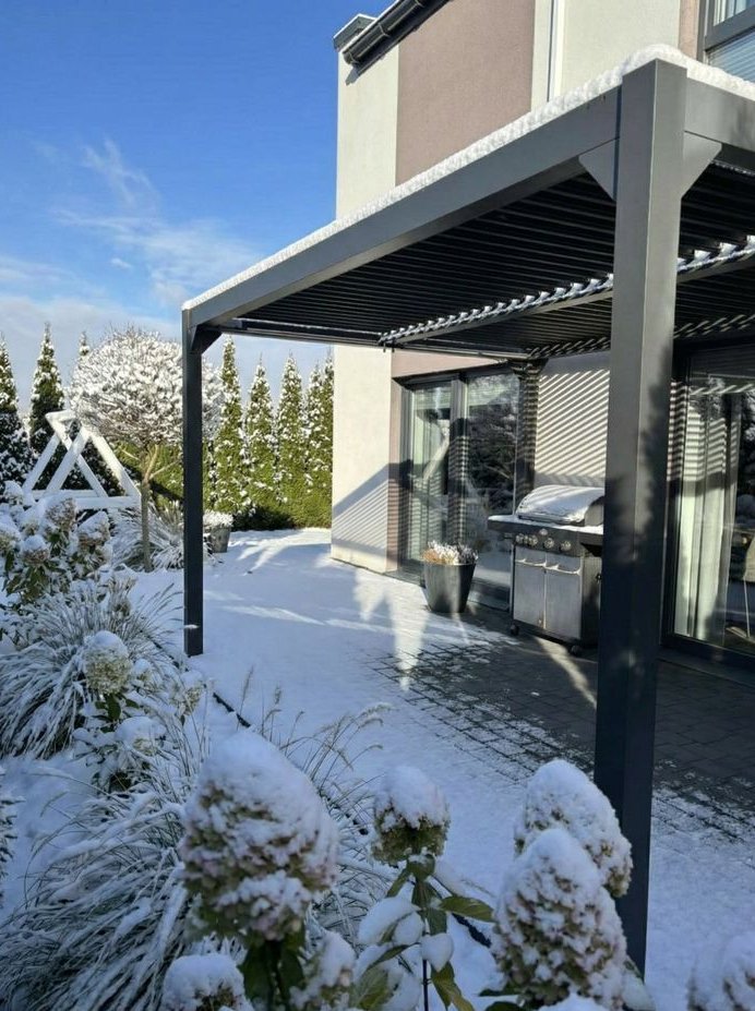 Taras Premium: Z nowoczesną, aluminiową pergolą wyposażoną w oświetlenie LED, którą można otwierać/zamykać.