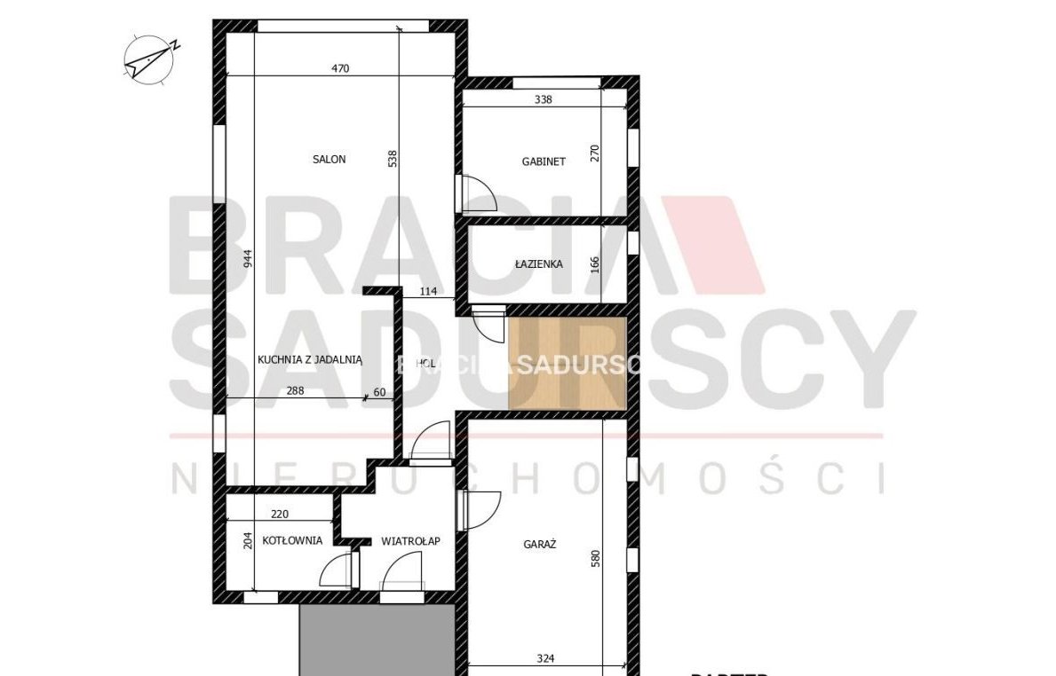 Parter: salon z kuchnią 38 m², gabinet/pokój, łazienka, pom. gospodarcze, garaż