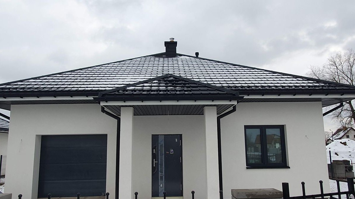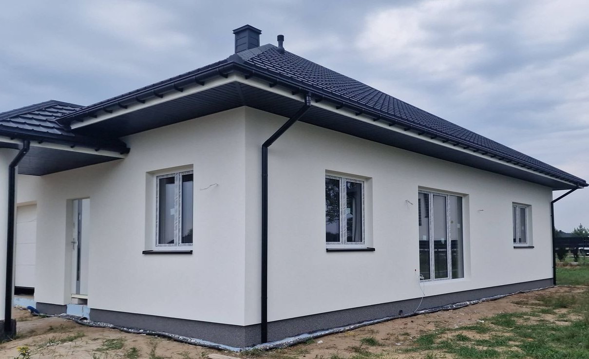 Technologia Wykonania: Bloczek komórkowy gr.24 cm, styropian na podłodze i elewacji o grubości 15 cm. Dach konstrukcji drewnianej kryty blachodachówką. Strop betonowy lany. Poddasze ocieplone natryskowo pianą pur 200 mm. Projekt zgodny ze Standardem WT 2021 - to lepsza izolacyjność termiczna ścian, oraz wartość wskaźnika rocznego zapotrzebowania budynku na nieodnawialną energię pierwotną