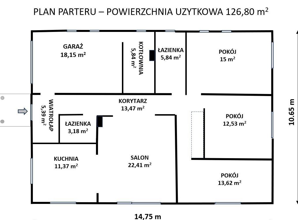 Dom jednorodzinny w zwartej bryle na podstawie prostokąta o powierzchni zabudowy 157,08 m2. Całkowita powierzchnia użytkowa 180 m2. Budynek składa się z parteru o powierzchni użytkowej 126,8 m2, w skład którego wchodzą: salon, kuchnia, dwie łazienki, trzy pokoje oraz garaż jednostanowiskowy i kotłownia oraz poddasza o powierzchni użytkowej 59,44 m2 (całkowita 133,46 m2) do własnej aranżacji (na poddaszu wyprowadzona kanalizacji, woda, prąd i ogrzewanie)
