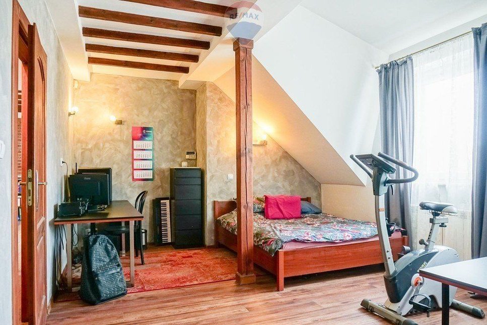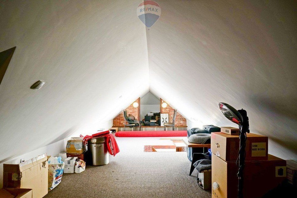 Budynek posiada strych ok 70m2, wykończony, z oknem, oświetleniem i ogrzewaniem. Sufit dwuspadowy, w najwyższym punkcie ok 185cm wys., pomieszczenie może więc służyć jako dodatkowy pokój do pracy lub jako przestrzeń do przechowywania.