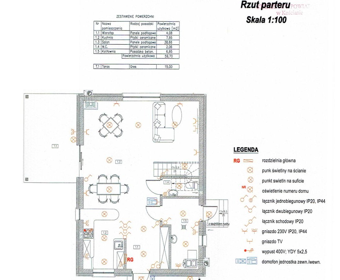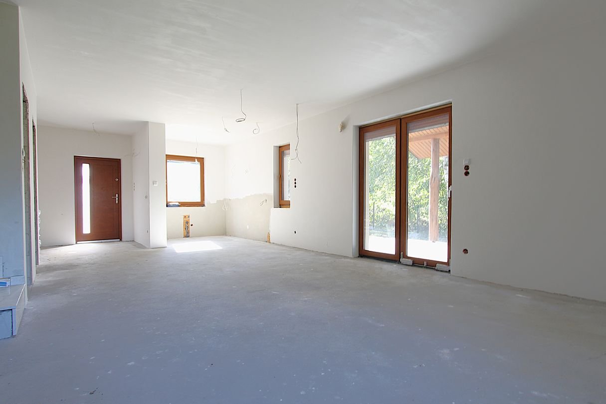 - salon z aneksem kuchennym – 46,6 m2 – wyjście na taras o powierzchni 15 m2
