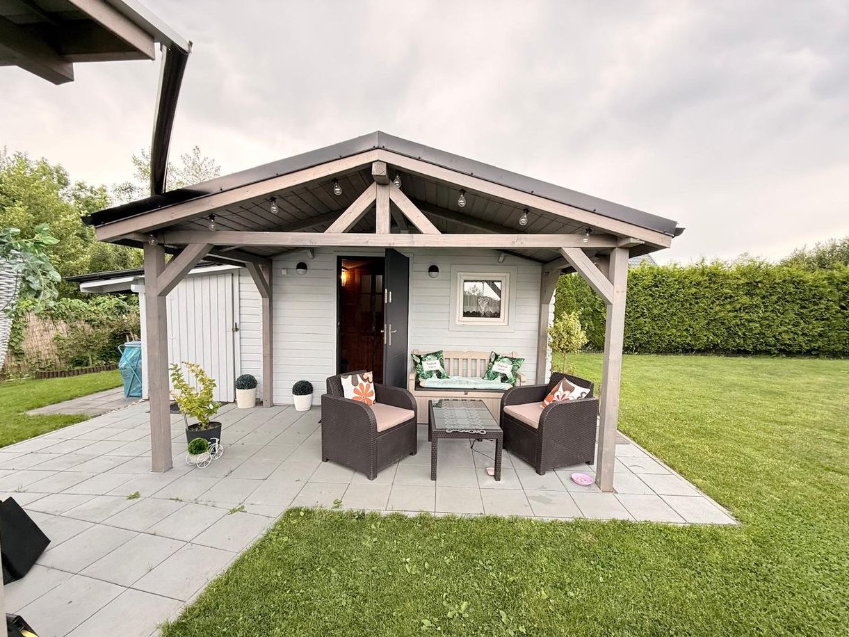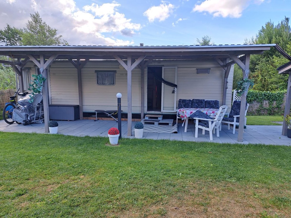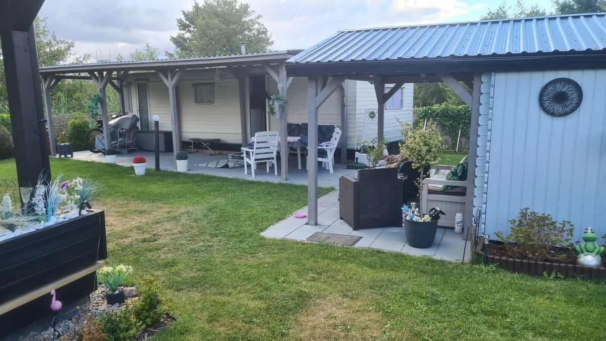 Na działce stoi całoroczny domek holenderski o powierzchni ok. 33m2, w którym jest duży pokój, kuchnia, dwie dodatkowe sypialnie i łazienka.
