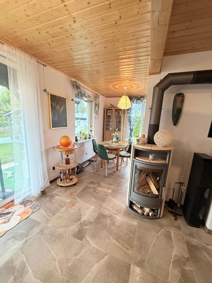 W domu znajduje się kominek i dodatkowo klimatyzacja z grzaniem.
