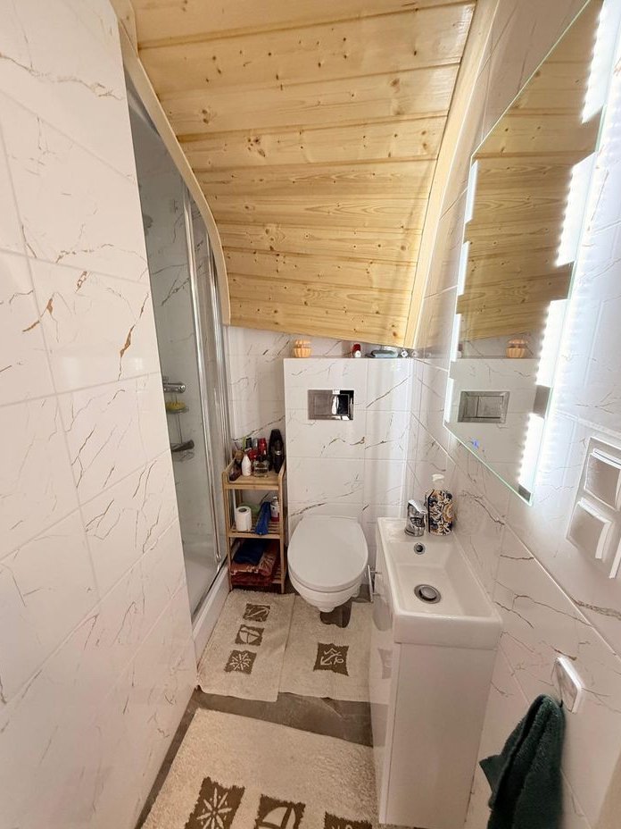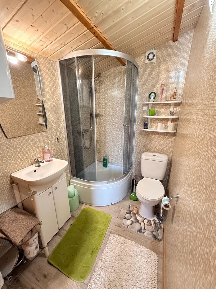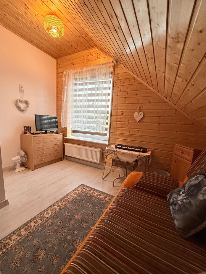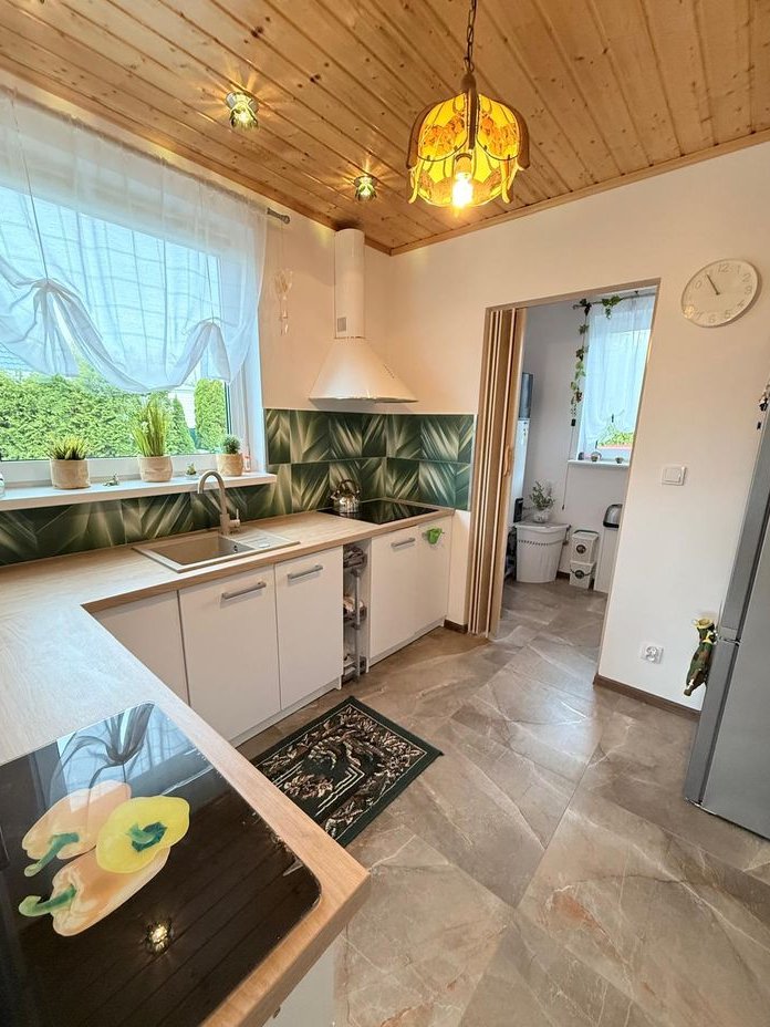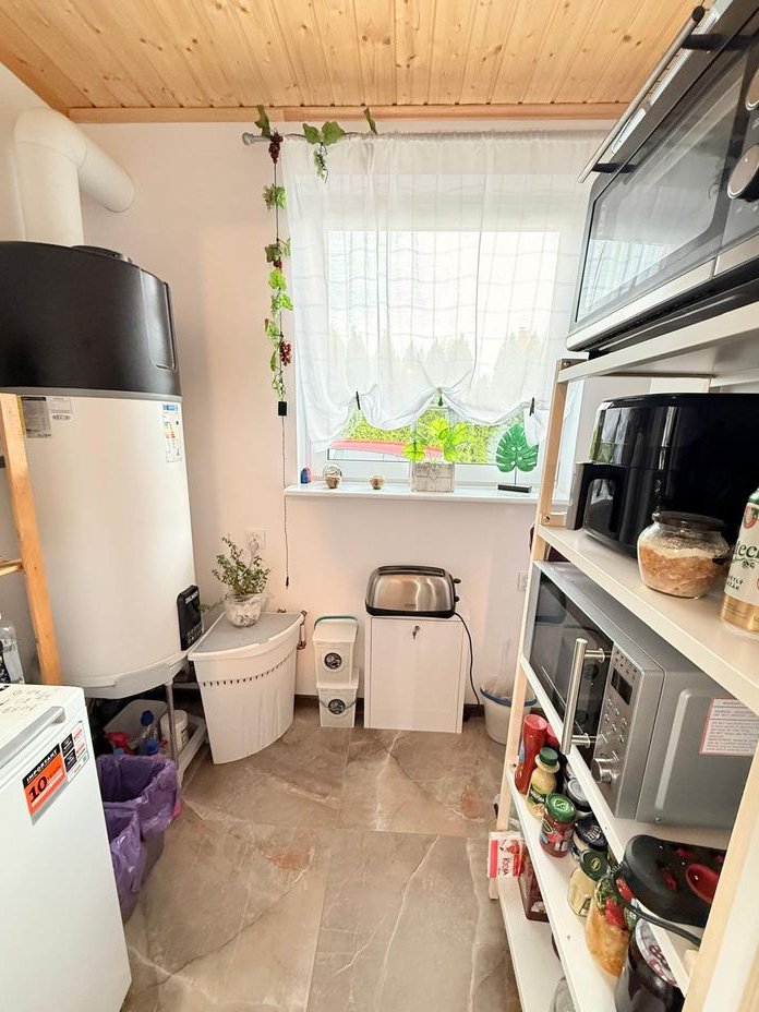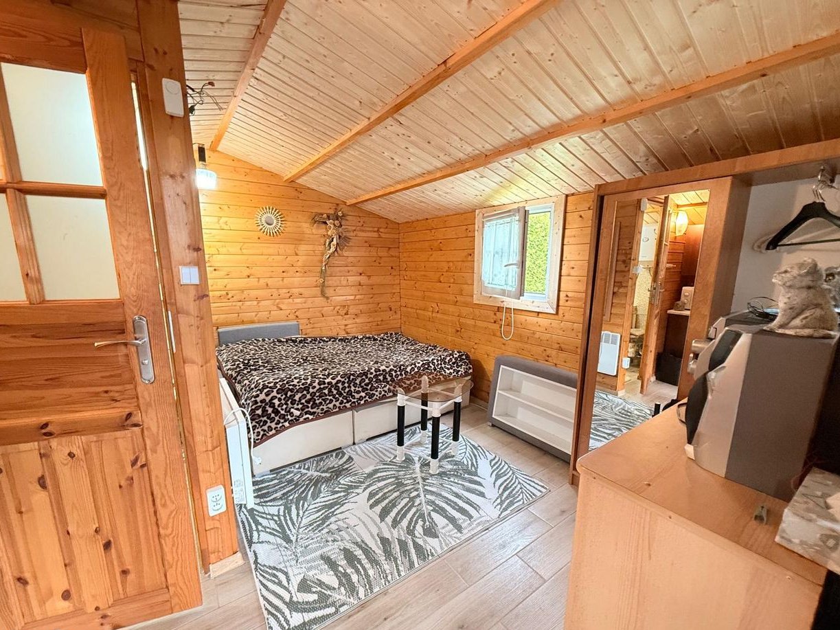 Obok usytuowany jest mniejszy całoroczny domek z jedną sypialnią, kuchnią, łazienką, a tuż przy nim na zewnątrz znajduje się pomieszczenie gospodarcze.