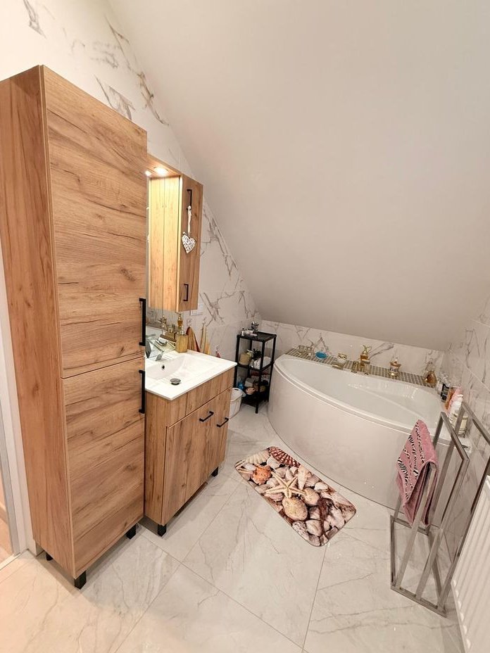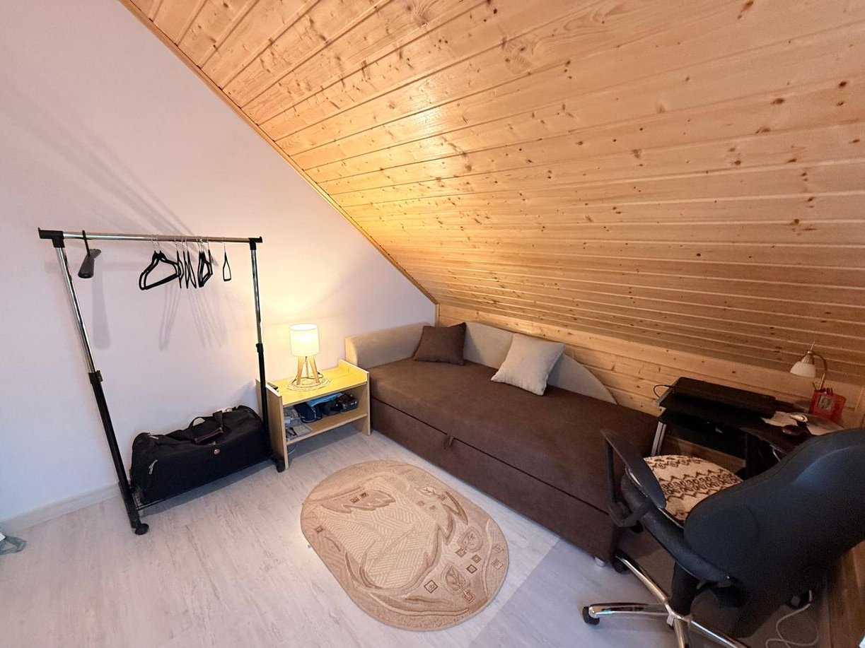 I Piętro (powierzchnia całkowita: 44,11 m2, powierzchnia użytkowa 31 m2): 3 rozkładowe sypialnie, łazienka z wanną narożną.