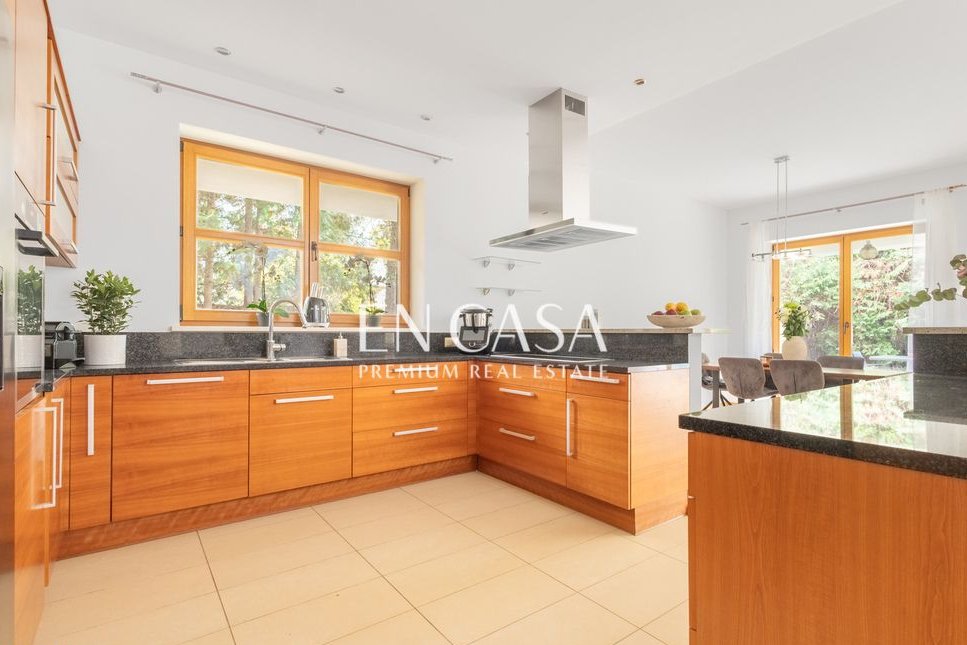 Kuchnia wyposażona we wszystkie niezbędne sprzęty AGD wysokiej klasy. Uwagę zwraca imponujący kominek w salonie. Dom jest gotowy do zamieszkania od zaraz, posiada wszystkie niezbędne zabudowy i instalacje, takie jak: szafy wnękowe, garderoby, automatyczne podlewanie ogrodu, moskitiery itp. Dom posiada 3 sypialnie oraz dodatkowo dużą, jasną piwnicę z oknami, która może również pełnić funkcję pokoju gościnnego.