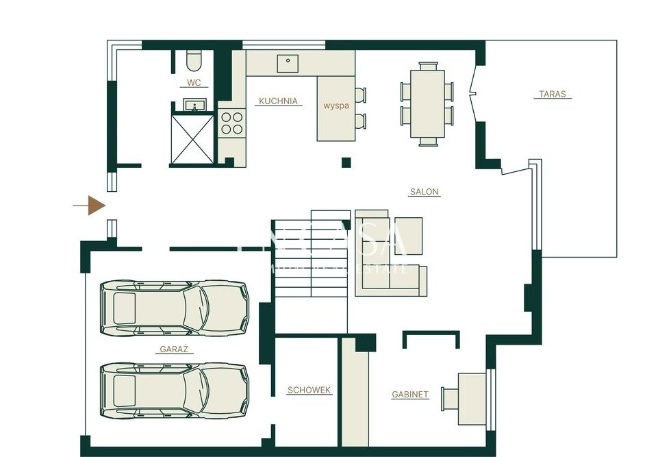 Parter: salon, gabinet, kuchnia, garderoba, toaleta, garaż (łącznie około 146,50 m2)
