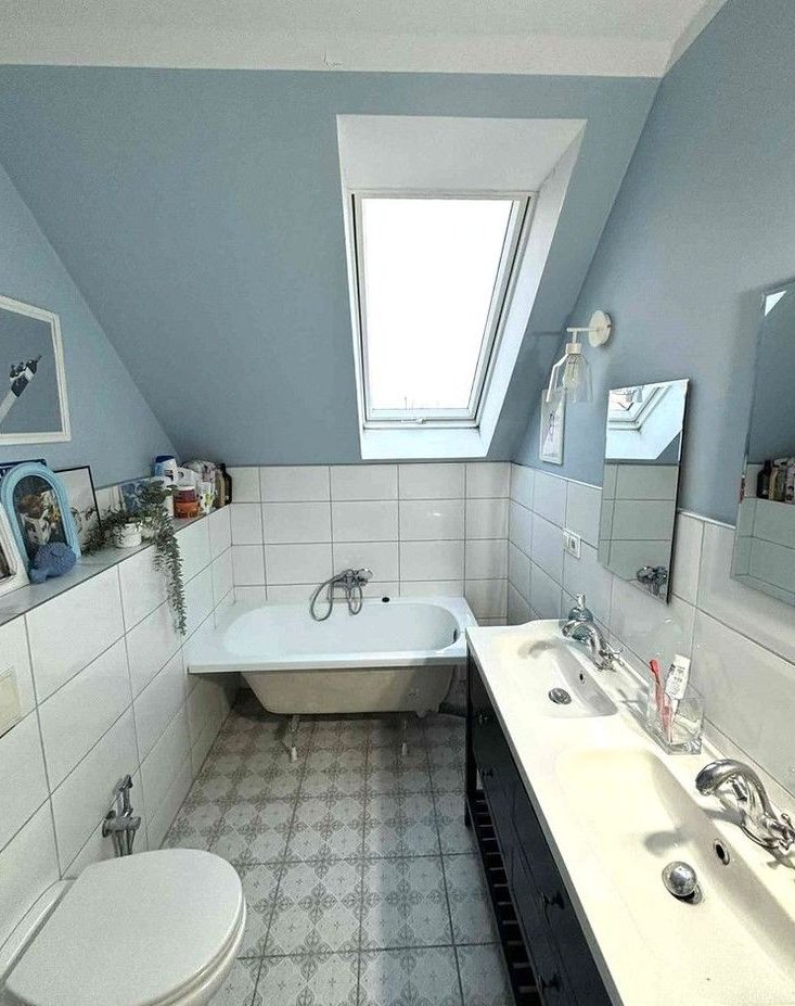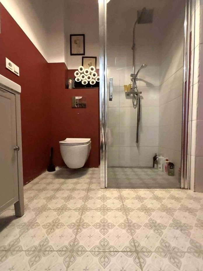Łazienki wykończone w glazurze i terakocie, ta na parterze z kabina prysznicową, na poddaszu z wanną.