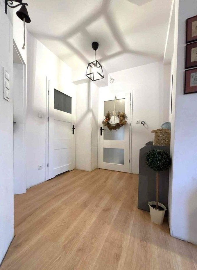 Podłogi w pokojach na obydwu kondygnacjach, w kuchni- panele, ściany gładź. W wiatrołapie i w kotłowni na podłodze terakota.