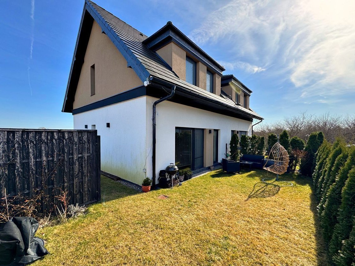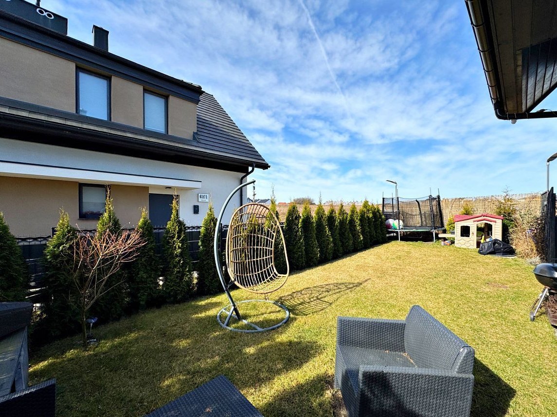 Przedmiotem oferty, jest dom w zabudowie bliźniaczej 4 pokojowy (pow. całkowita ze strychem ok. 120 m2 / pow. użytkowa 80,14 m2) postawiony na działce o powierzchni 1350 m2 (w udziale 1/6) przy czym część użytkowa ogródka tylnego wynosi ok. 60 m2 oraz części frontowej (wejściowej) ok. 70 m2.