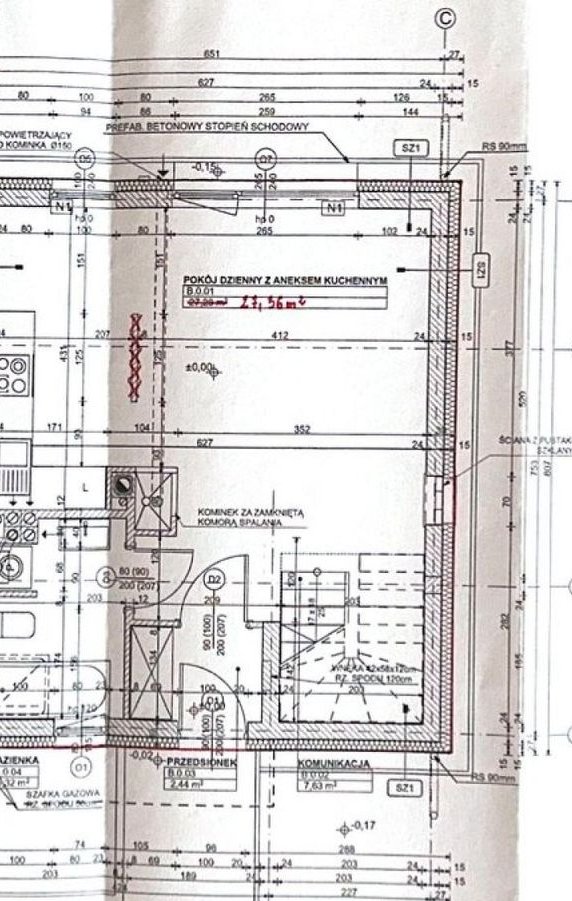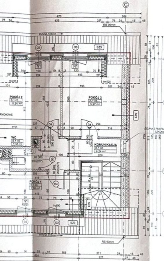 - Strop nad parterem betonowy, a nad piętrem drewniany ocieplony wełną 30 cm.