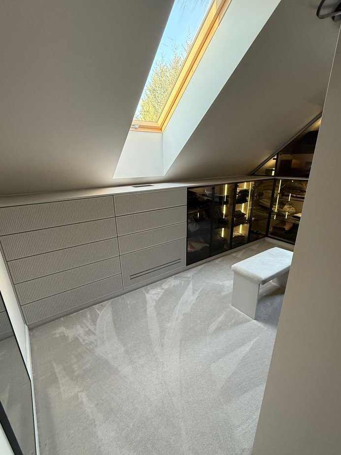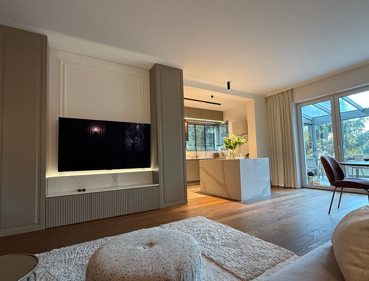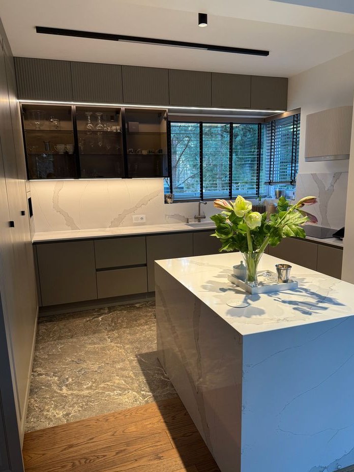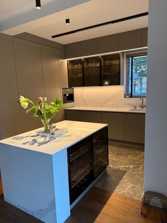 Kuchnia w zabudowie, blaty oraz wyspa wykonane z konglomeratu kwarcowego. Piekarnik wielofunkcyjny, lodówka, ekspres, winiarka oraz płyta 6 palnikowa firmy MIELE.