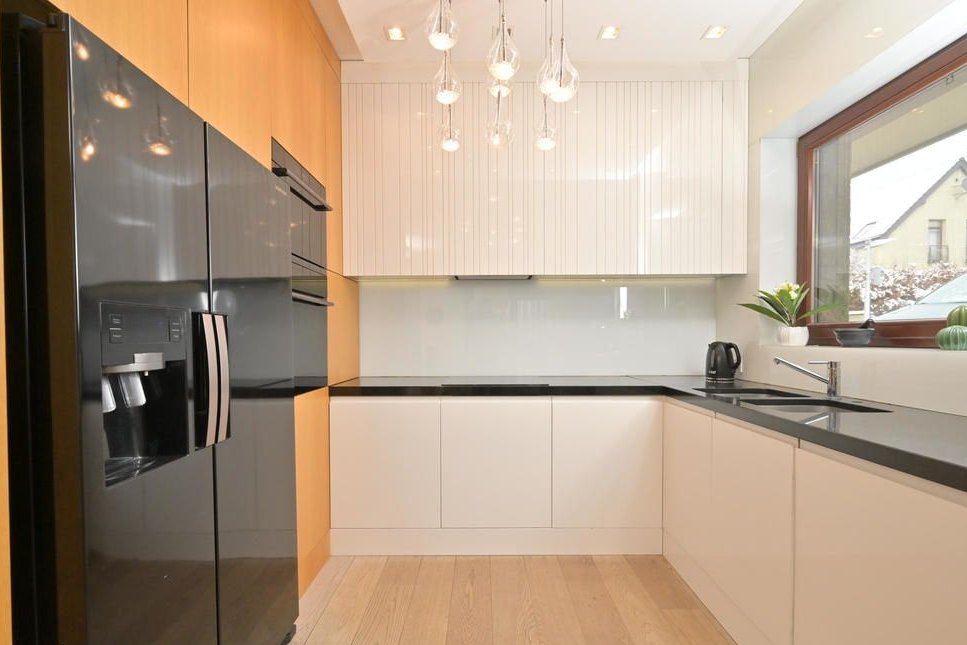 otwarta kuchnia z wydzieloną częścią jadalnianą,