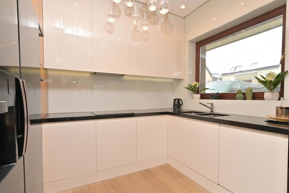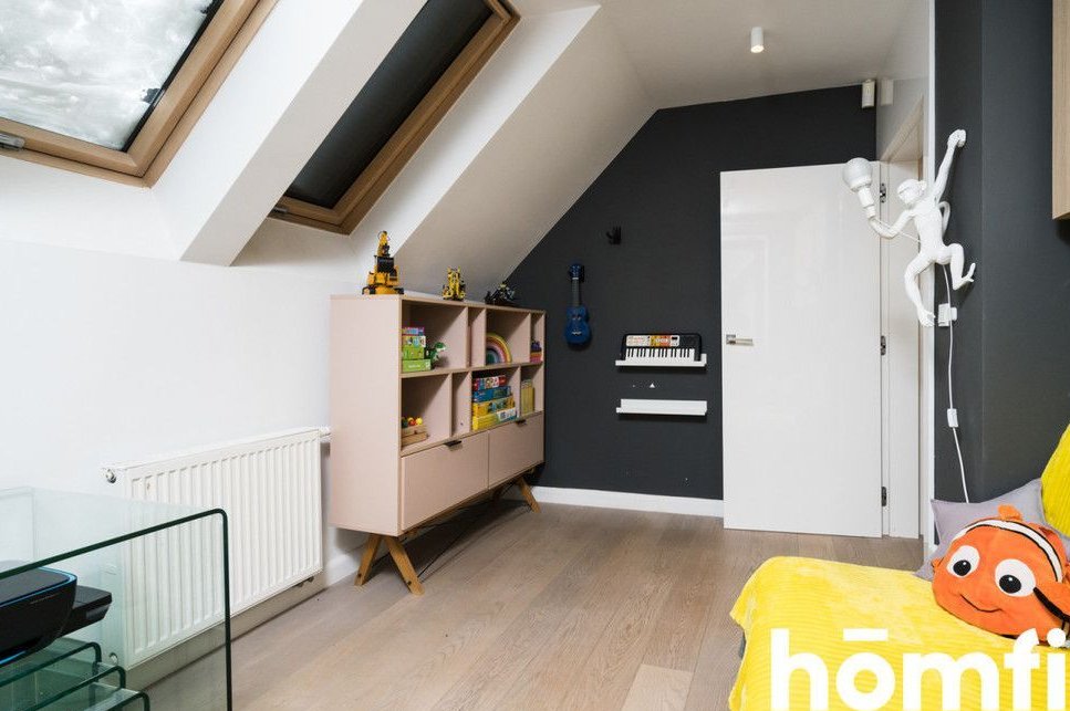 Dom wyposażono w system Smart Home – Fibaro, który umożliwia zaawansowane, wygodne sterowanie funkcjami budynku. Przestronne okna zapewniają obfitość naturalnego światła, a widok na otaczającą zieleń podkreśla wyjątkowy charakter tej nieruchomości.