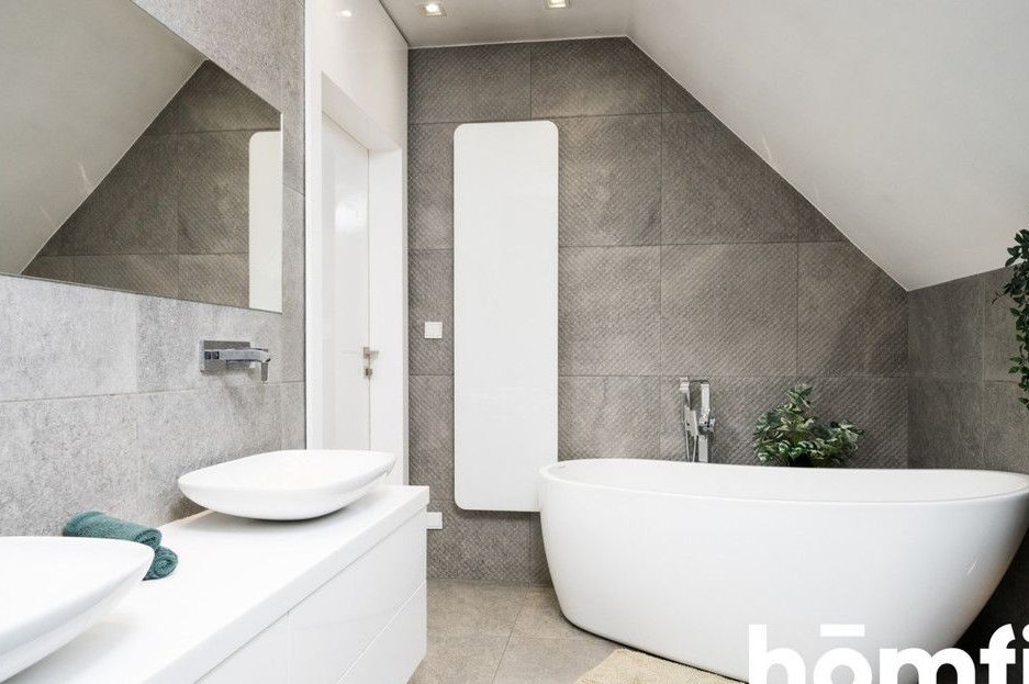 Dom wykończony w wysokim standardzie, według projektu wnętrz autorstwa Artdesign, z dbałością o detale oraz zastosowaniem naturalnych materiałów, takich jak drewno i kamień.