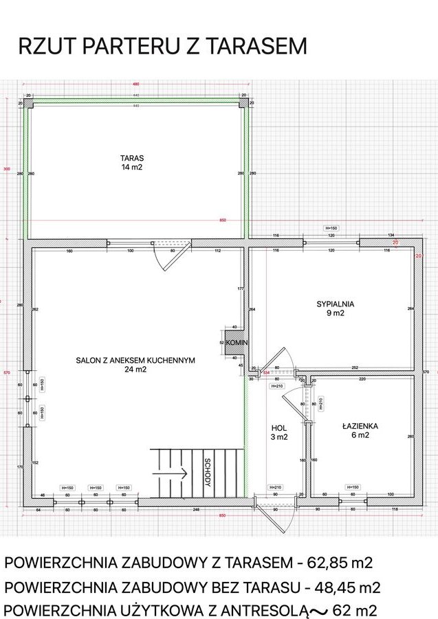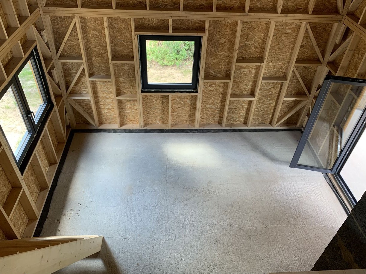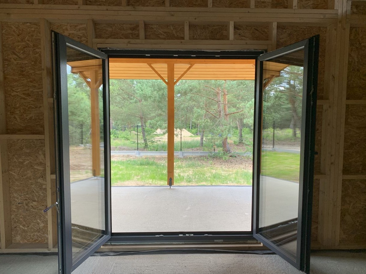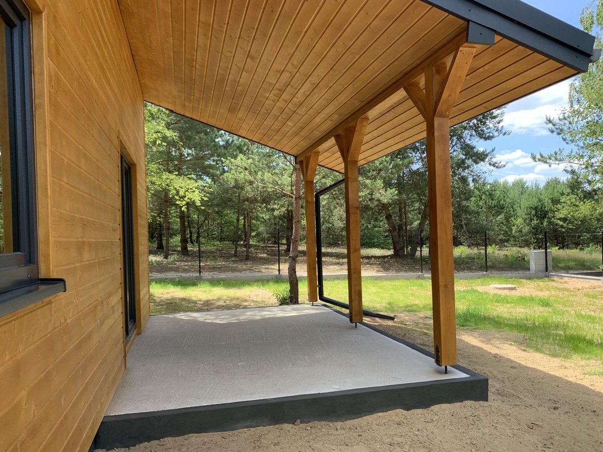 - szkielet wykonany z certyfikowanego drewna konstrukcyjnego C24 – 45x145mm, ściany wewnętrzne C24 – 45x95mm, mocowany na kotwy stalowe M10x140 do płyty fundamentowej odizolowany folią