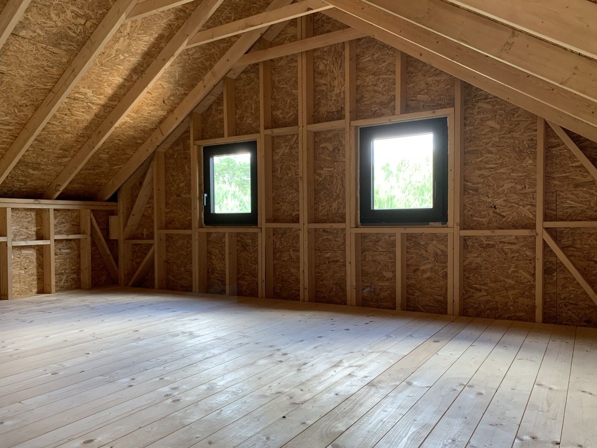 - stropopodłoga - deska 28 mm na antresoli na pióro-wpust, dzięki obróbce z obu stron pełni funkcję zarówno wytrzymałej podłogi, jak i estetycznego sufitu