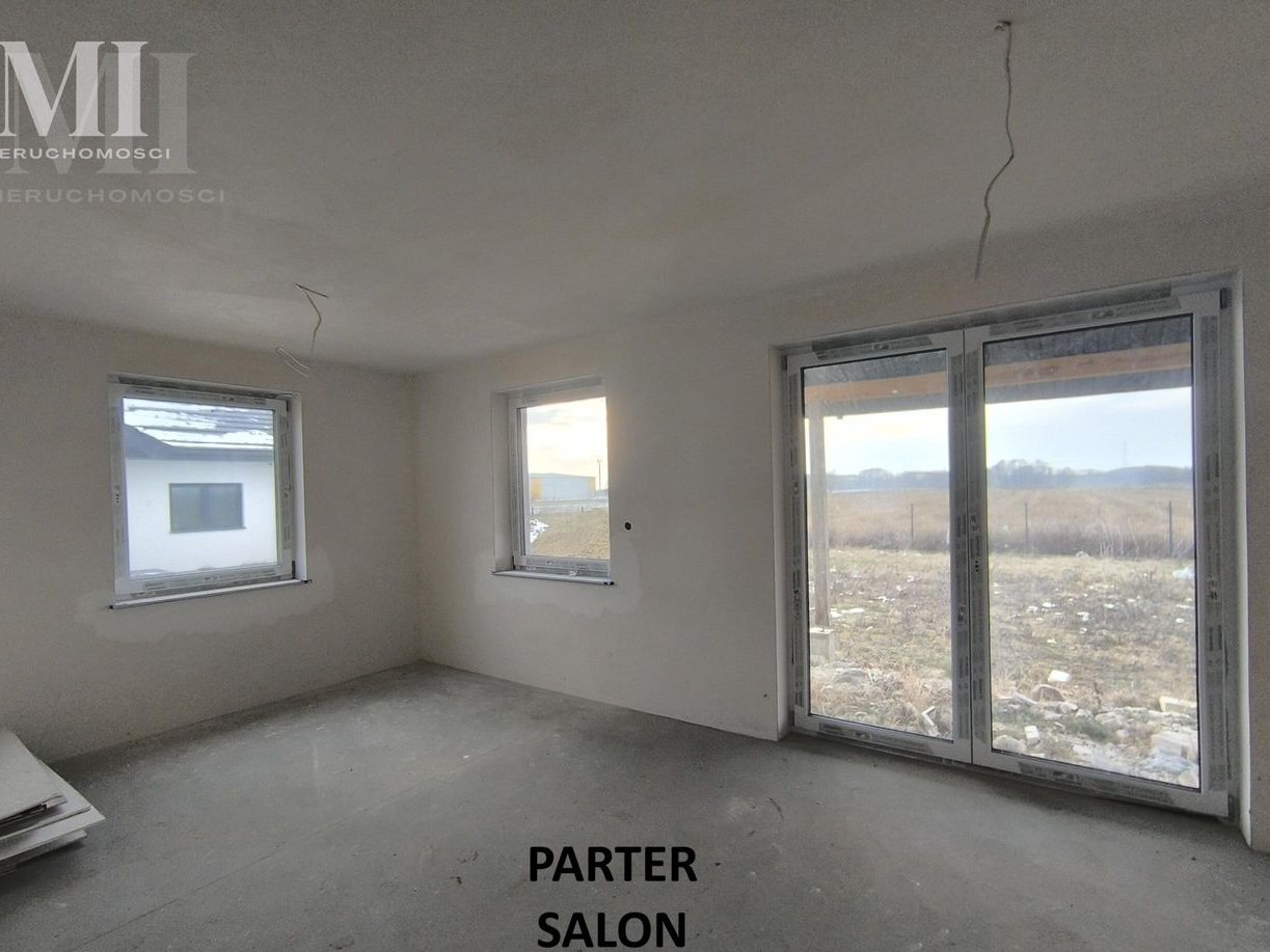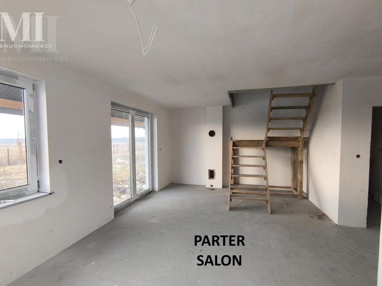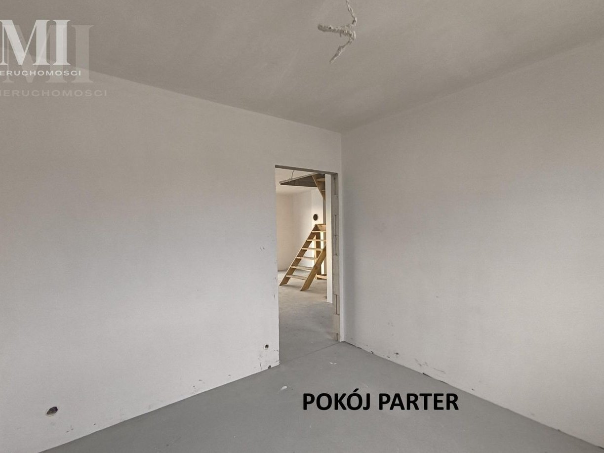 Parter: wiatrołap, duży salon z wyjściem na ogród, otwarta kuchnia, łazienka oraz dodatkowy pokój.