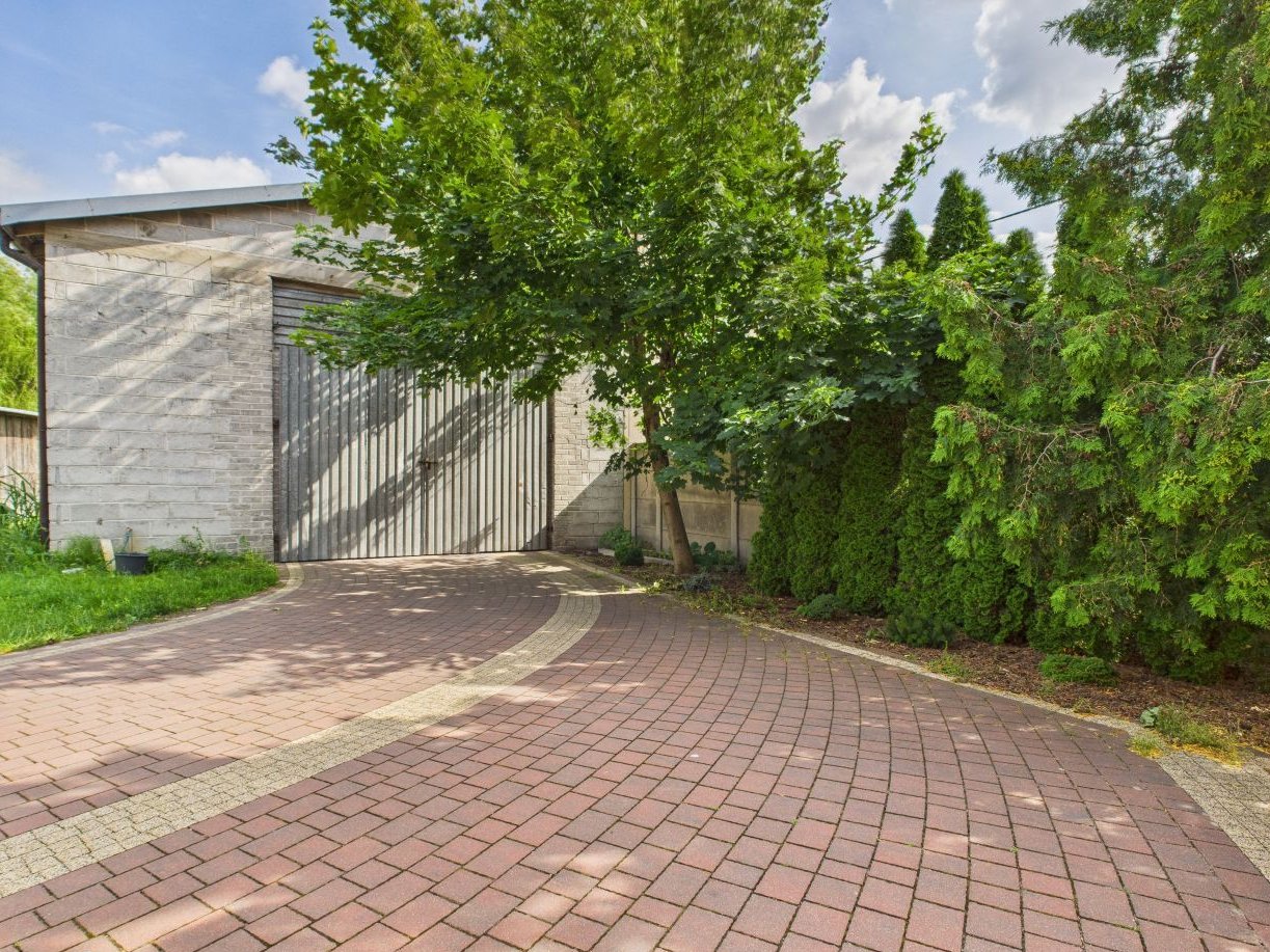 Teren ogrodzony metalowym ogrodzeniem, brama przesuwna z furtką, pozostały obszar zagospodarowany krzewami, wjazd utwardzony kostką.
