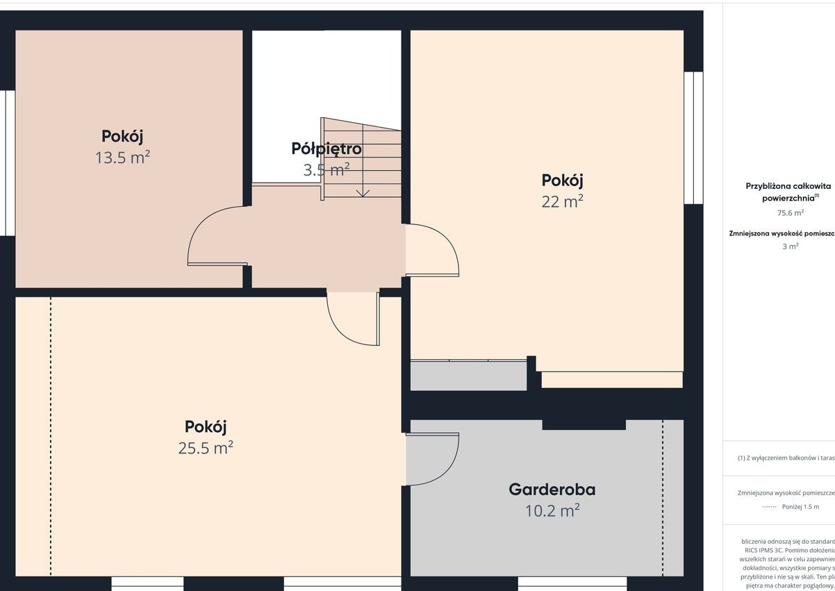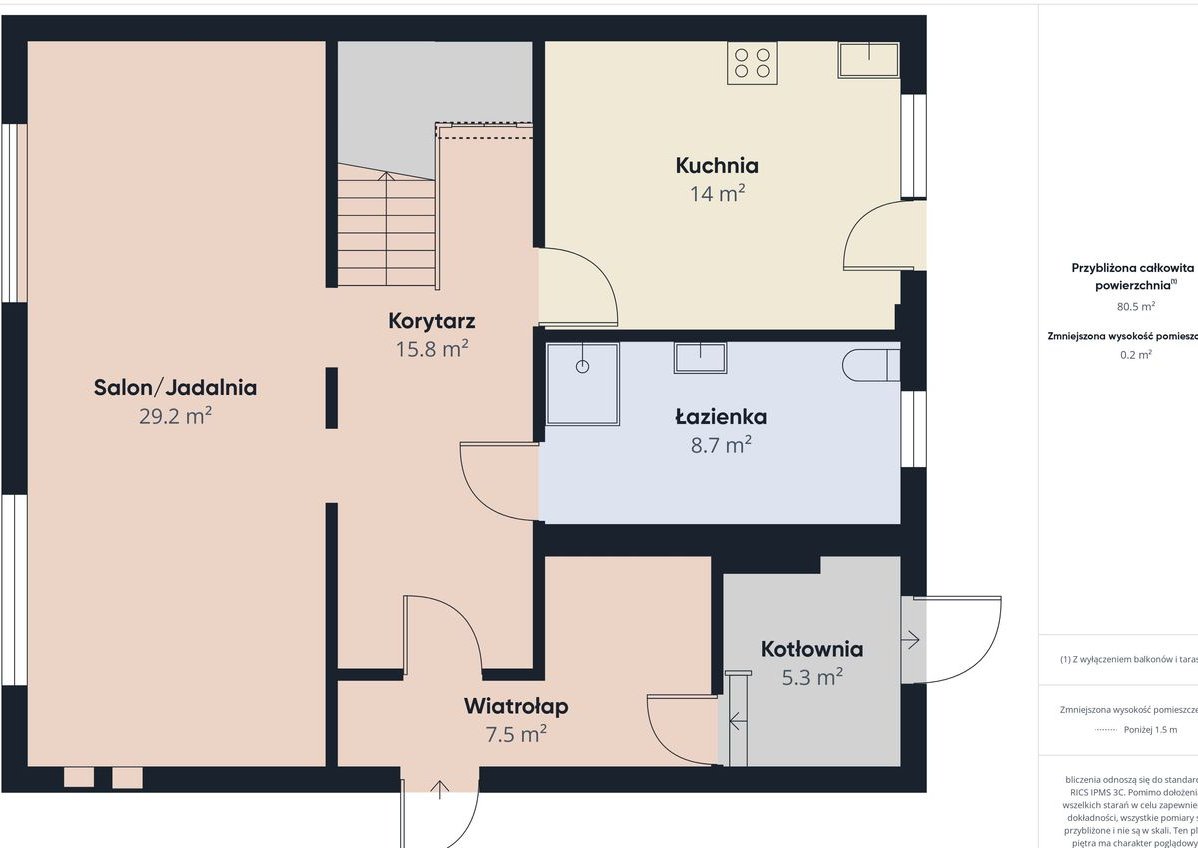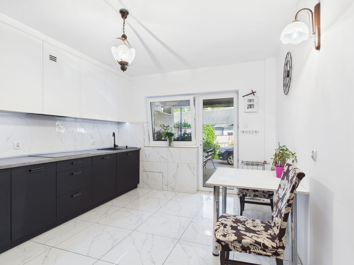 W skład pomieszczeń na parterze wchodzi salon ,kuchnia, łazienka, kotłownia i korytarz, natomiast w skład poddasza 3 pokoje i garderoba. Dodatkowym atutem jest duży taras 15,4m2 z wyjściem przez kuchnię.