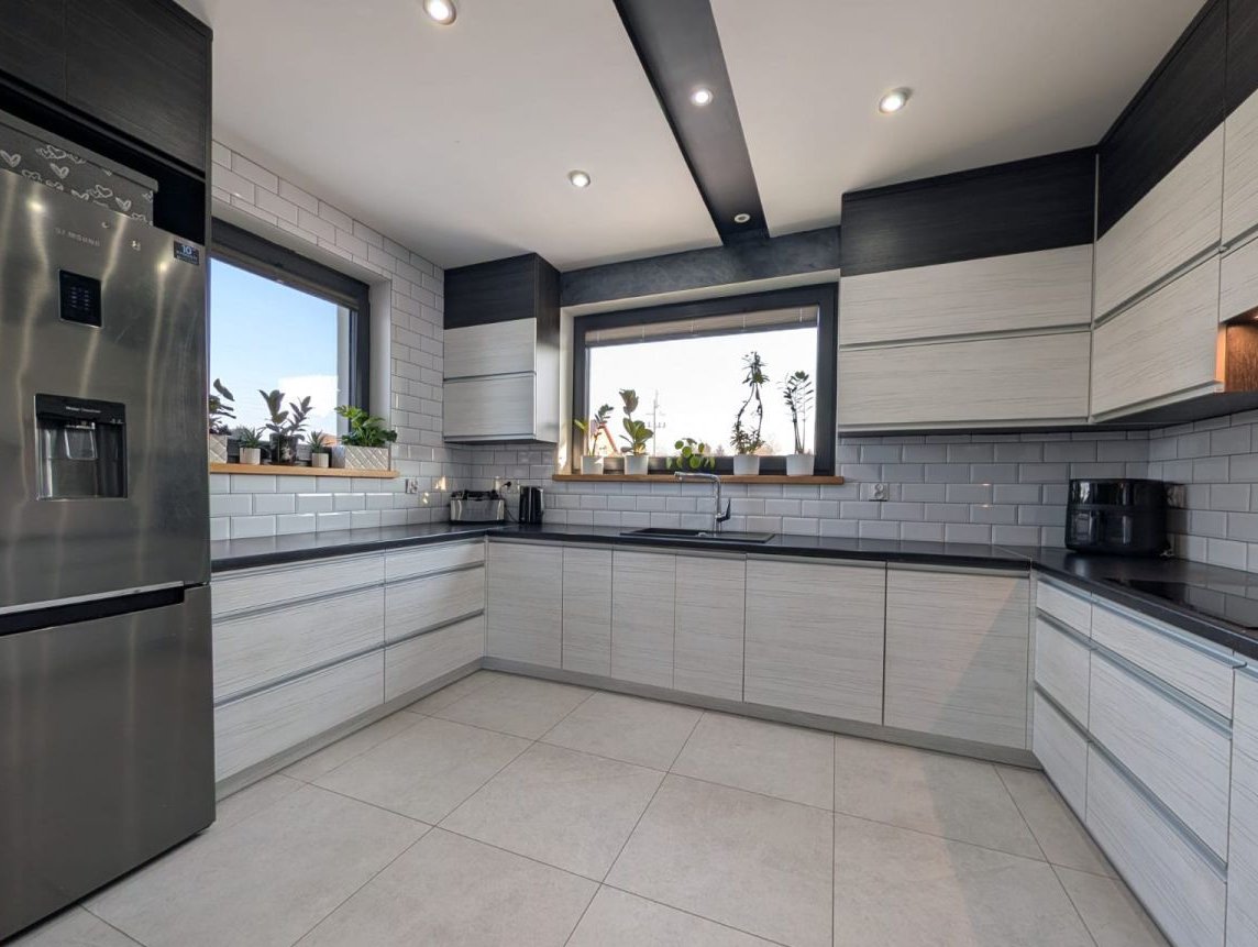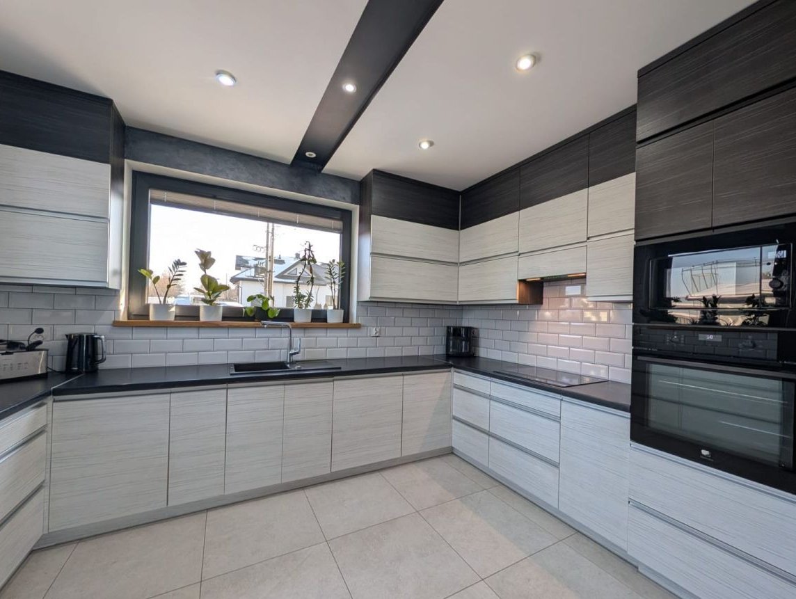 -duża, w pełni zabudowana kuchnia z nowoczesną zabudową i sprzętem
