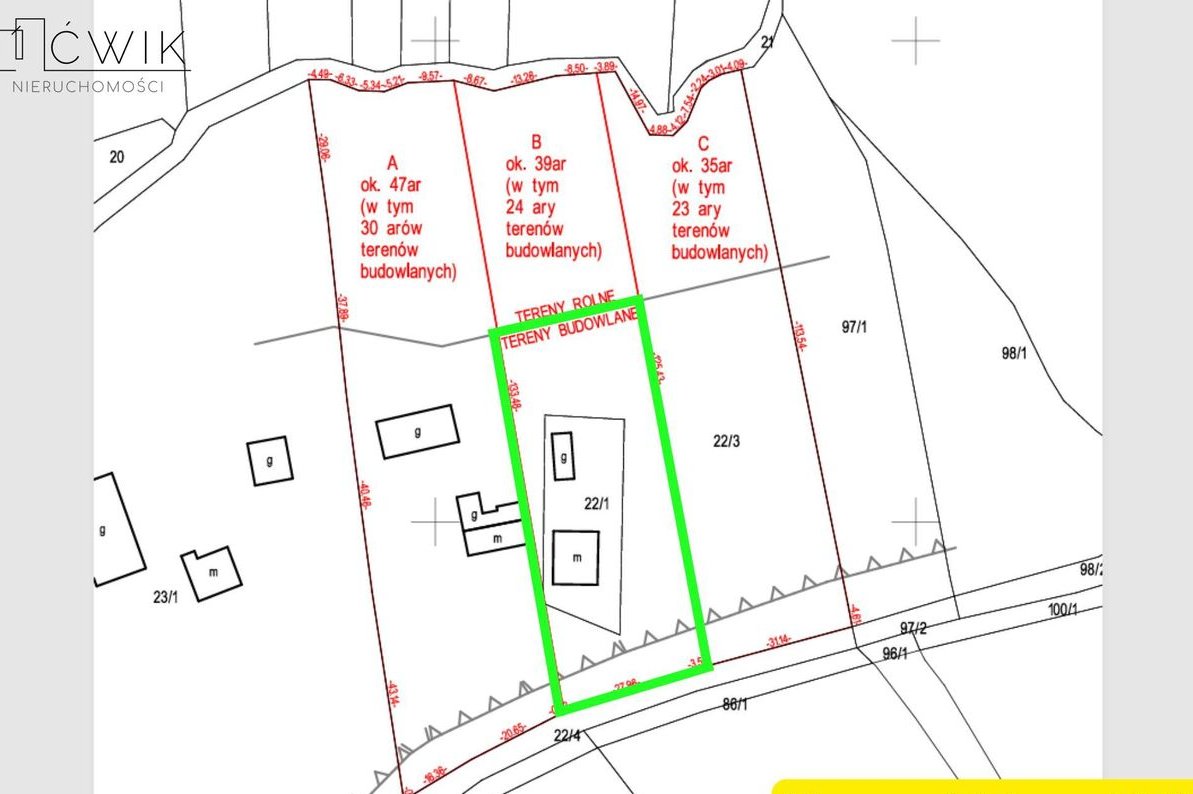 Działka: w trakcie podziału - ok. 24 ar przestrzeni, ogrodzona z 3 stron (mapa podziałowa dostępna w ofercie)