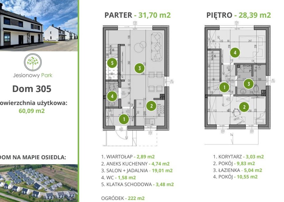 W tej inwestycji dostępne są również inne domy o pow. ok 60 m2 i 90 m2 zarówno w stanie deweloperskim jak i wykończonym. Informacje o dostępności poszczególnych domów znajdują się na stronie internetowej osiedla Jesionowy Park.