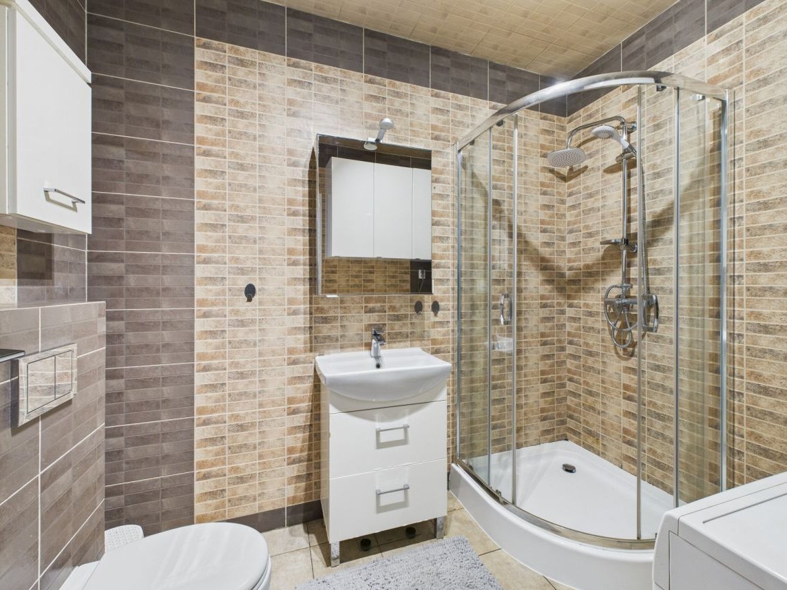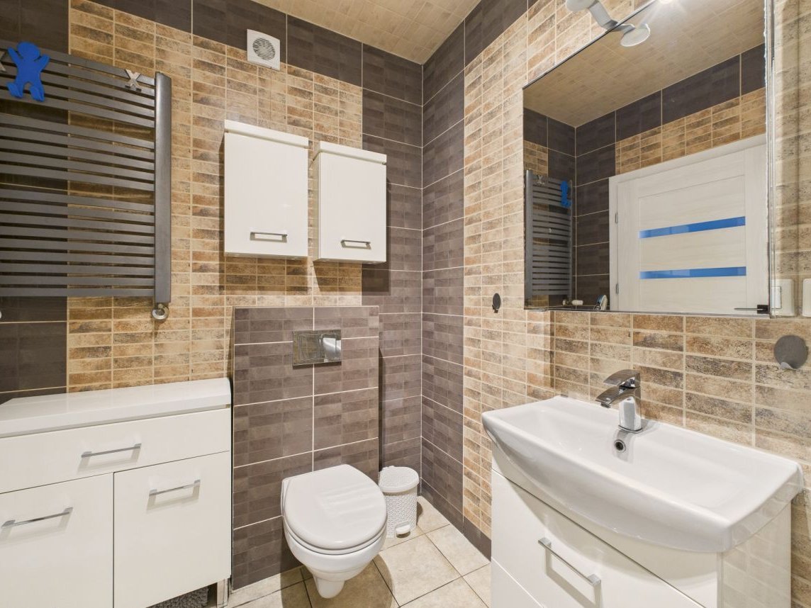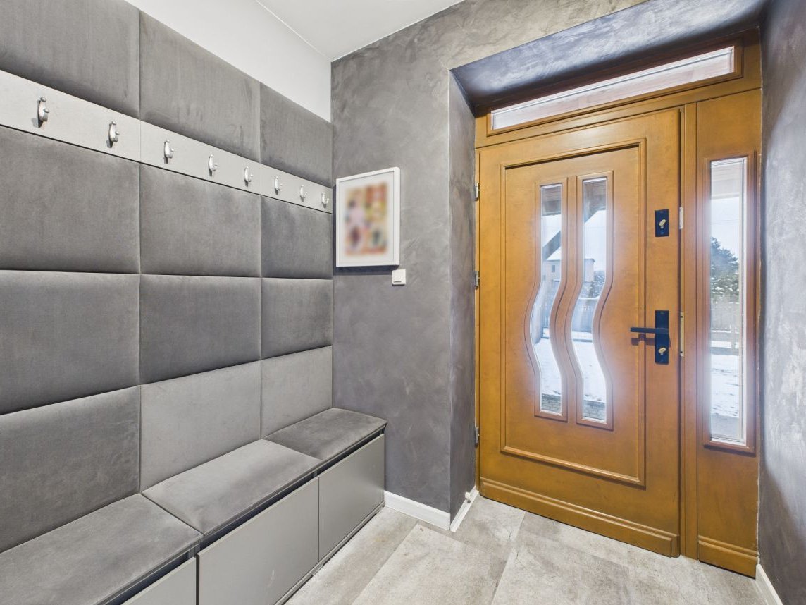 Dodatkowym atutem jest drugie, niezależne wejście prowadzące do dodatkowej części mieszkalnej. Znajduję się tam salon z aneksem kuchennym oraz łazienką, co daje możliwość wykorzystania tej przestrzeni jako samodzielne mieszkanie. W razie potrzeby część ta może zostać połączona z główną częścią domu, tworząc funkcjonalną całość.