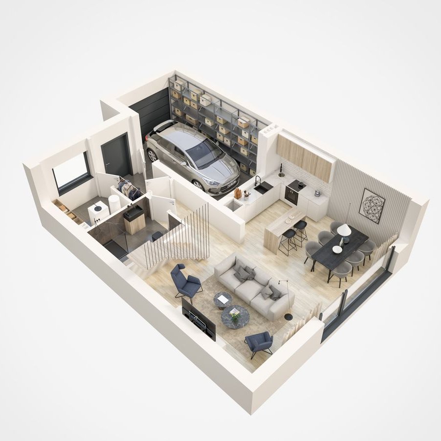 • Garaż z przejściem do wnętrza domu + miejsce postojowe zewnętrzne