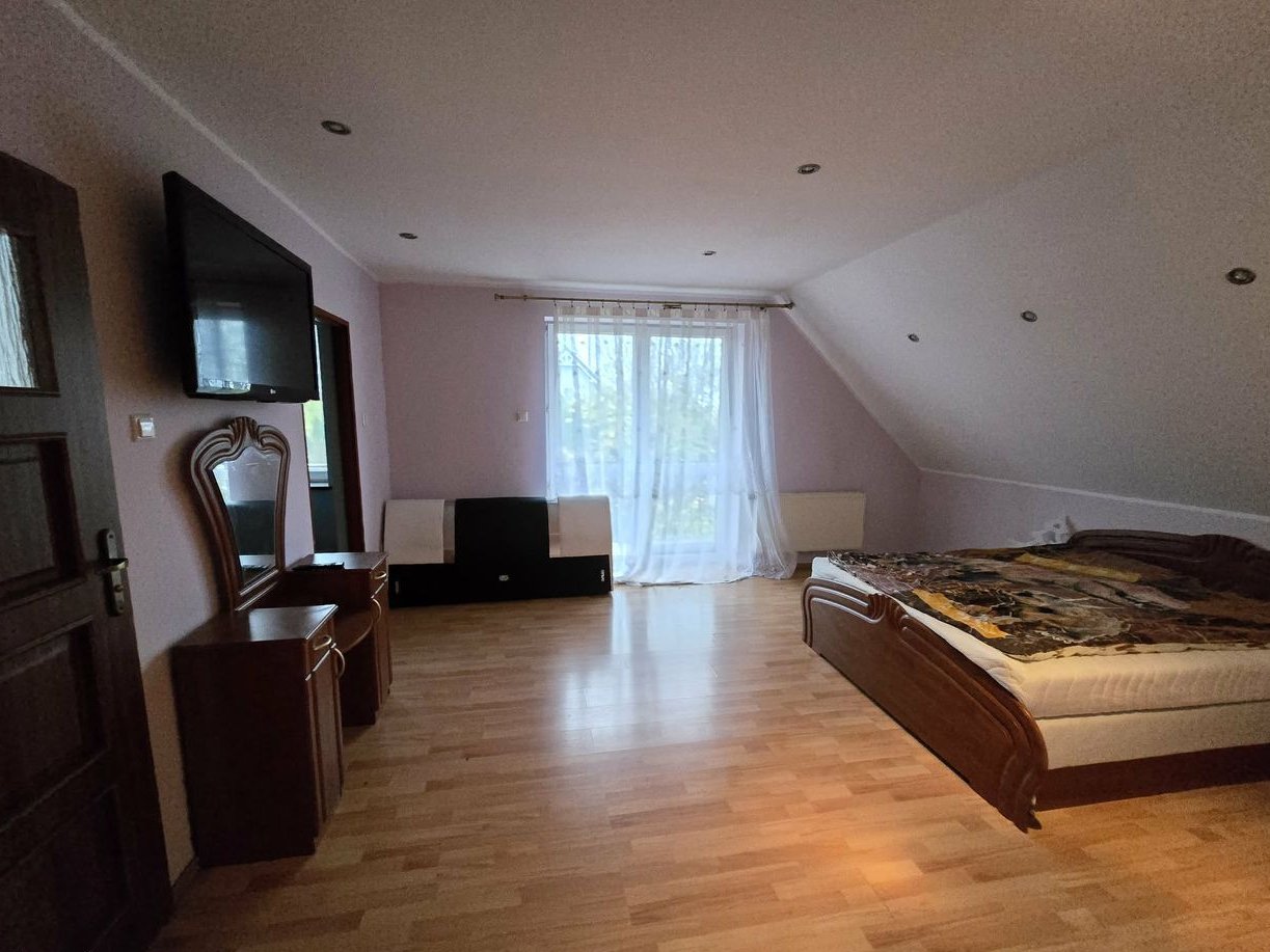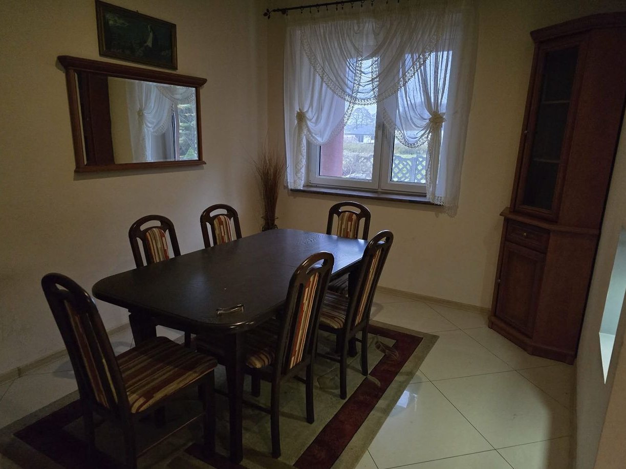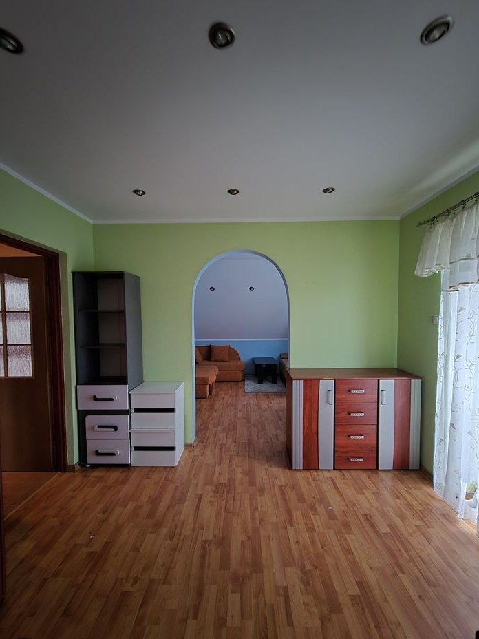 W domu znajdują się starsze meble oraz widoczne są ślady użytkowania (ściany, podłogi). Do uzgodnienia pozostaje, czy wyposażenie ma zostać dla nowego właściciela, czy zostanie usunięte przed przekazaniem nieruchomości.