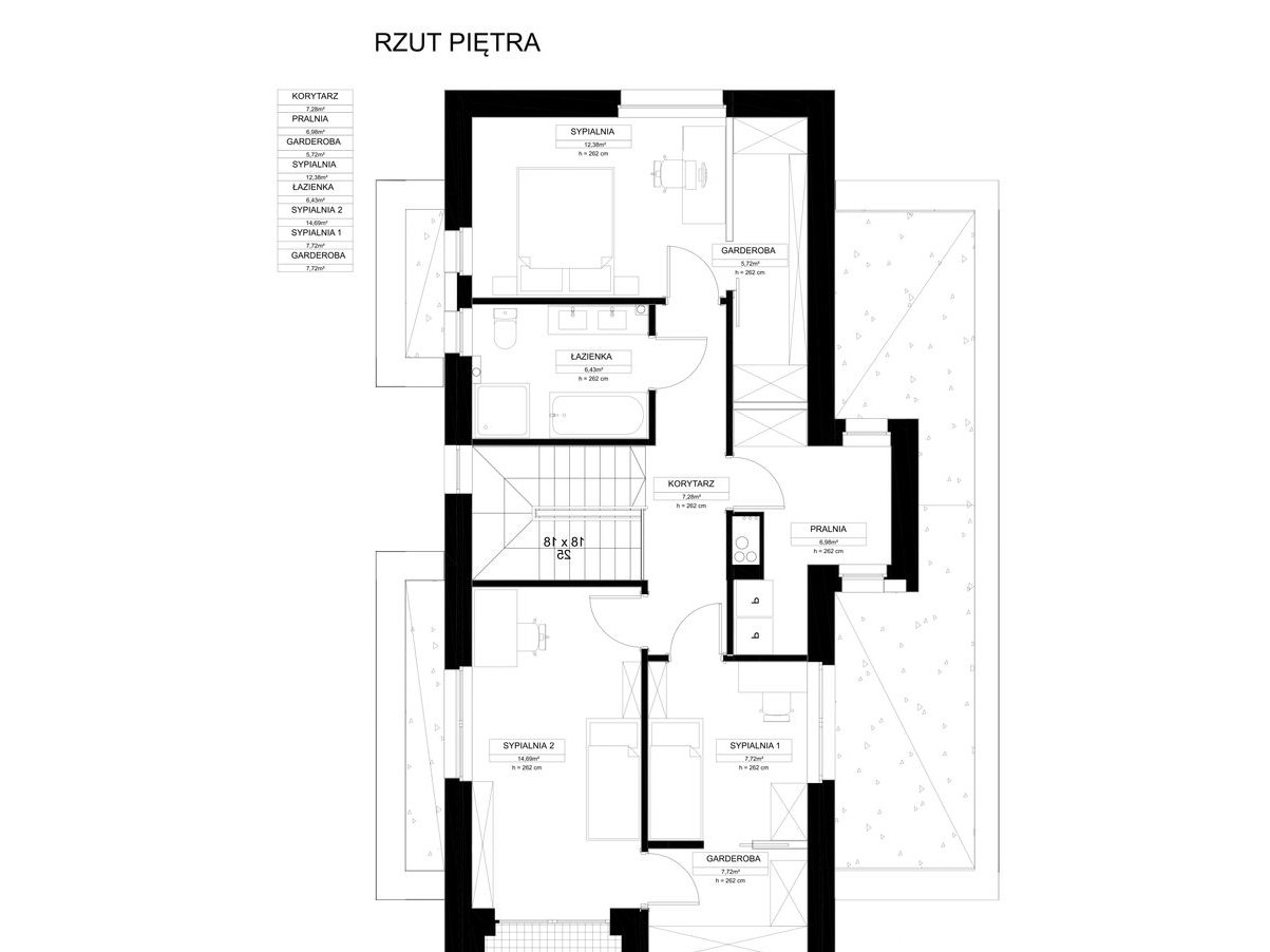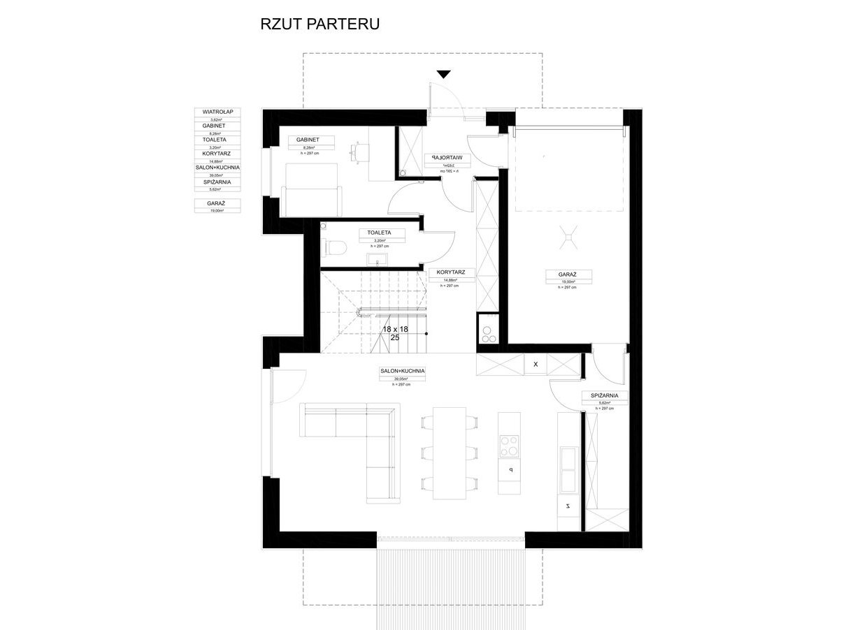 Dom zaprojektowany został z myślą o wygodnym użytkowaniu i dobrym doświetleniu wnętrz. Przestronna strefa dzienna z wyjściem na taras i ogród stanowi naturalne centrum domu, a układ pomieszczeń pozwala na elastyczną aranżację zgodnie z indywidualnymi potrzebami.