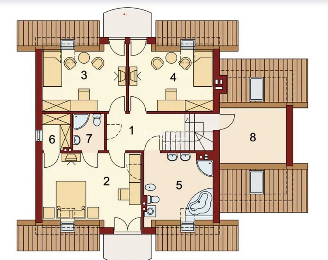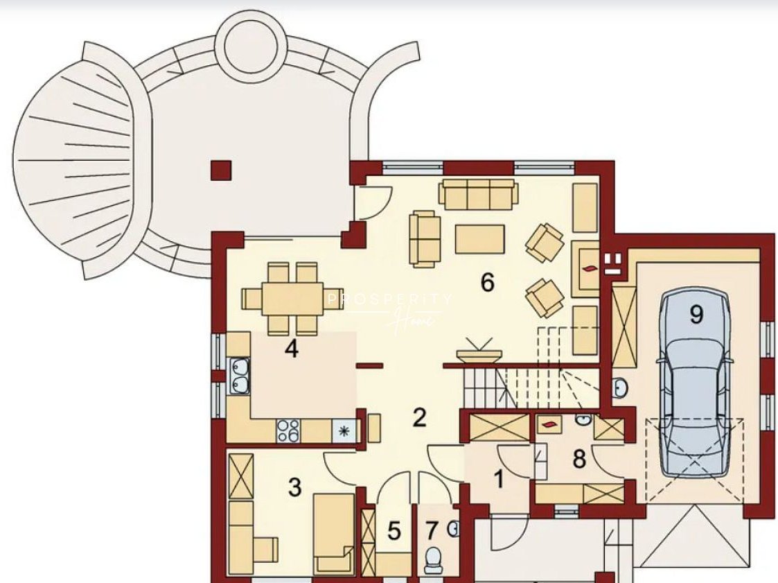 Dom jest dwukondygnacyjny (parter + piętro) i oferuje 170,5 m2 powierzchni całkowitej. W skład pomieszczeń wchodzą: przestronny salon, kuchnia, 4 pokoje, 2 łazienki oraz garaż w bryle budynku.