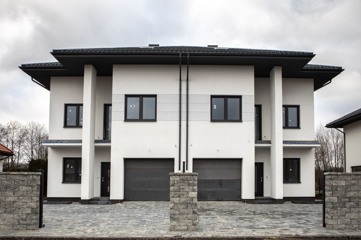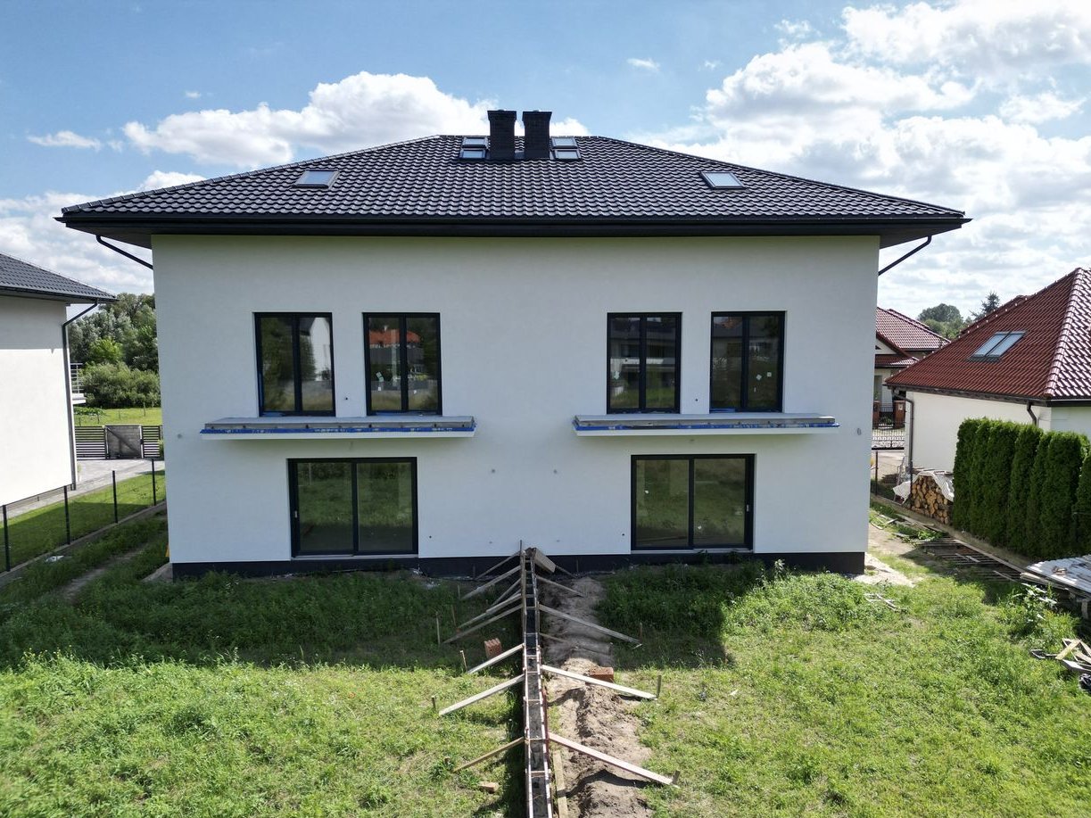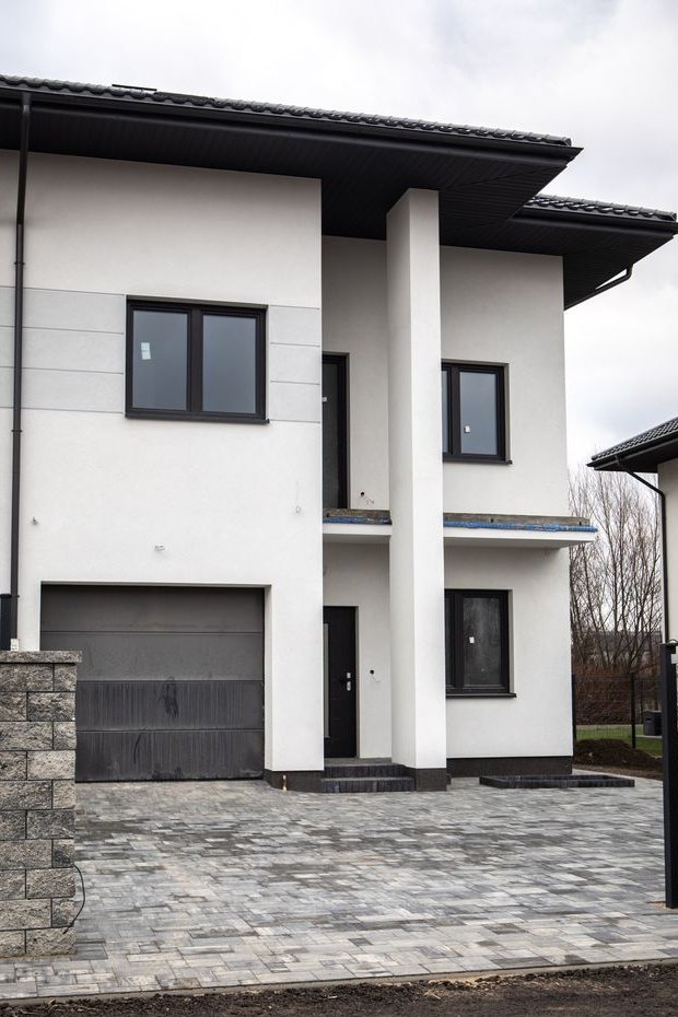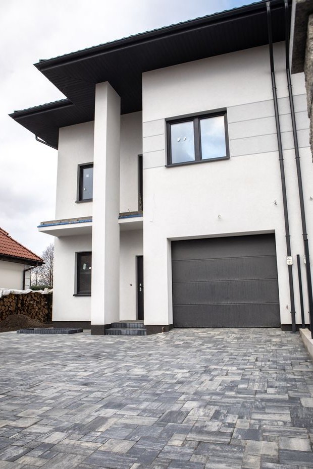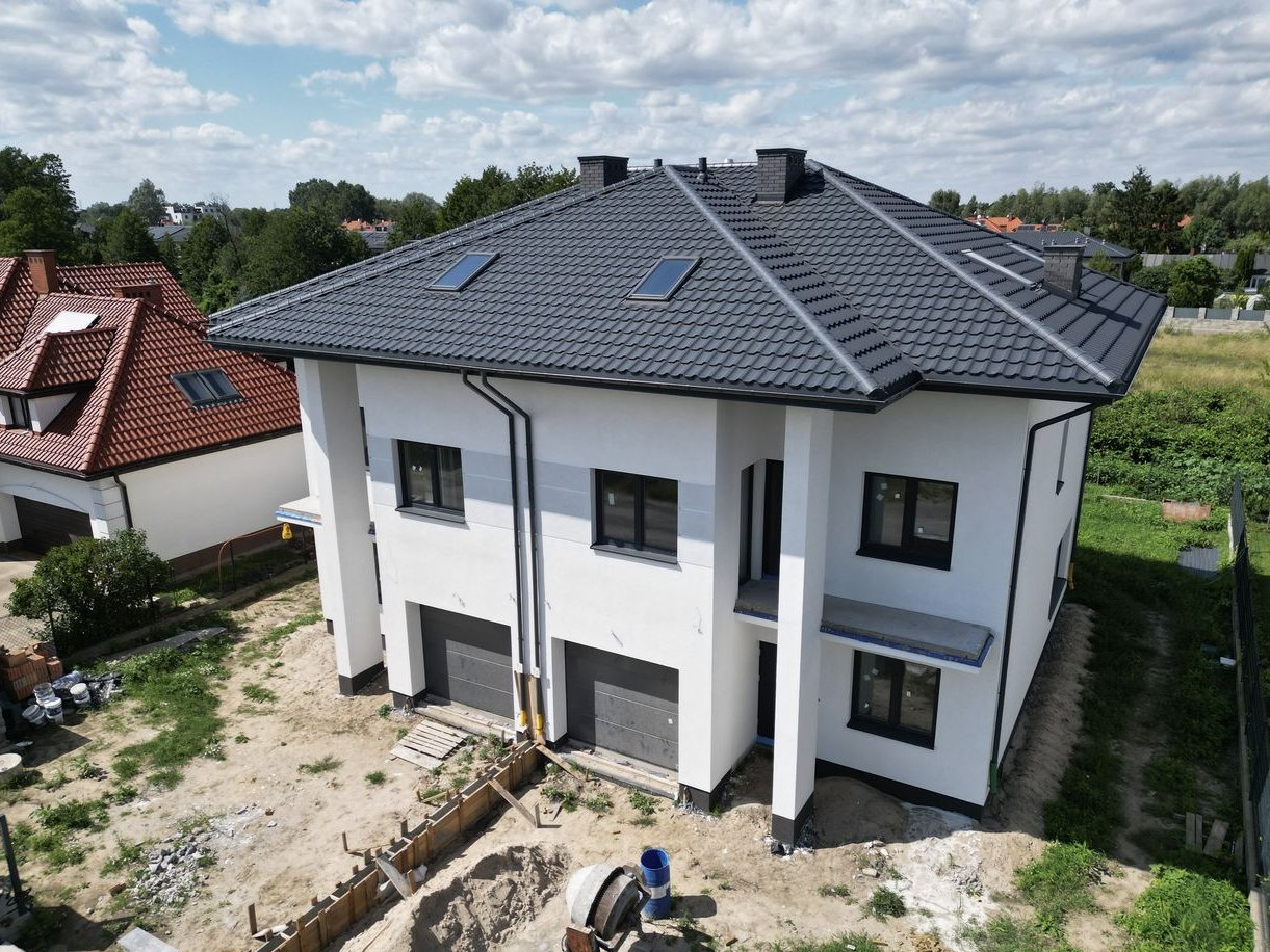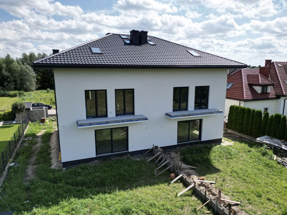 Dom w trakcie finalnych prac wykończeniowych do stanu deweloperskiego – z efektowną elewacją, ogrodzeniem i wykończonym już podjazdem z kostki.