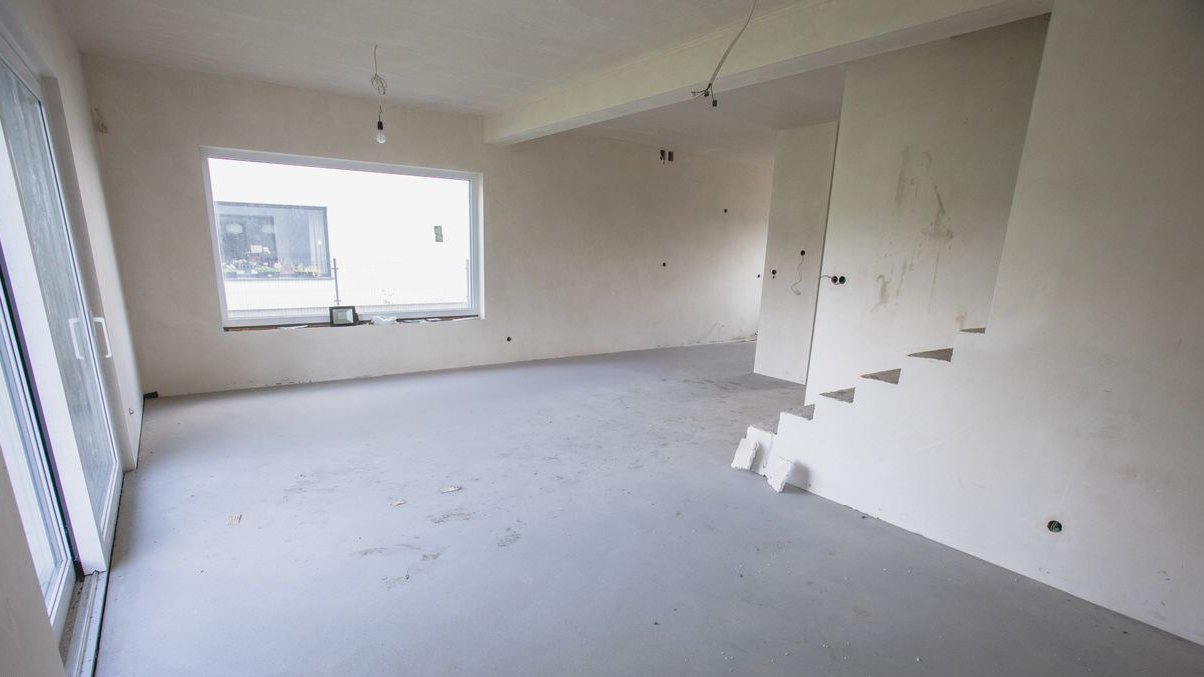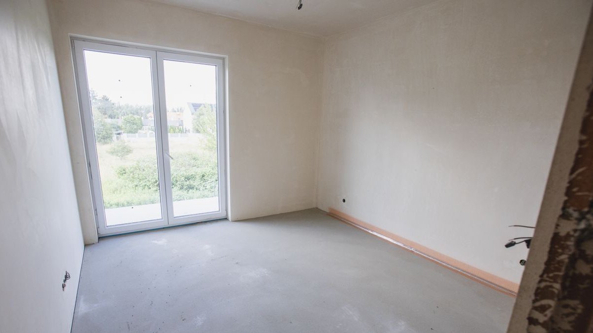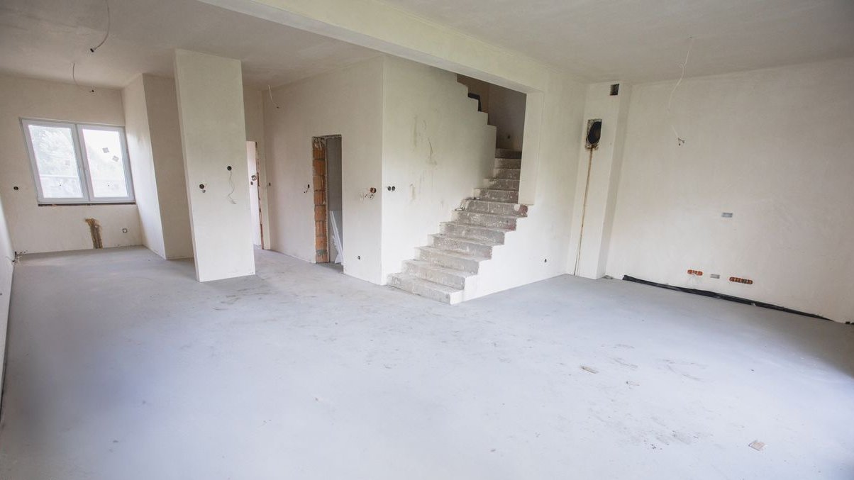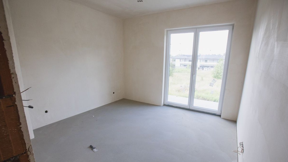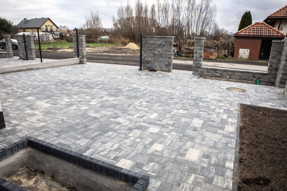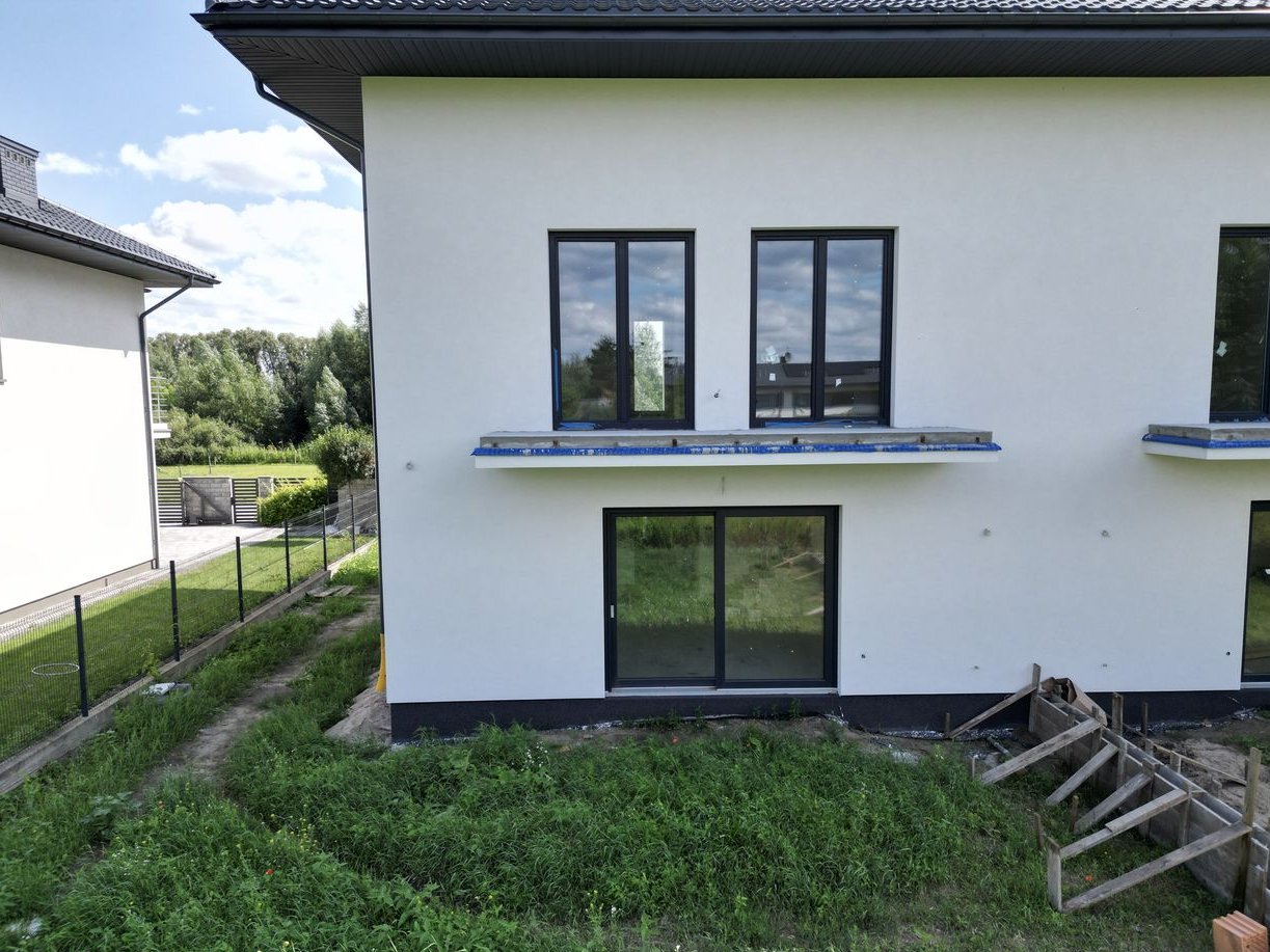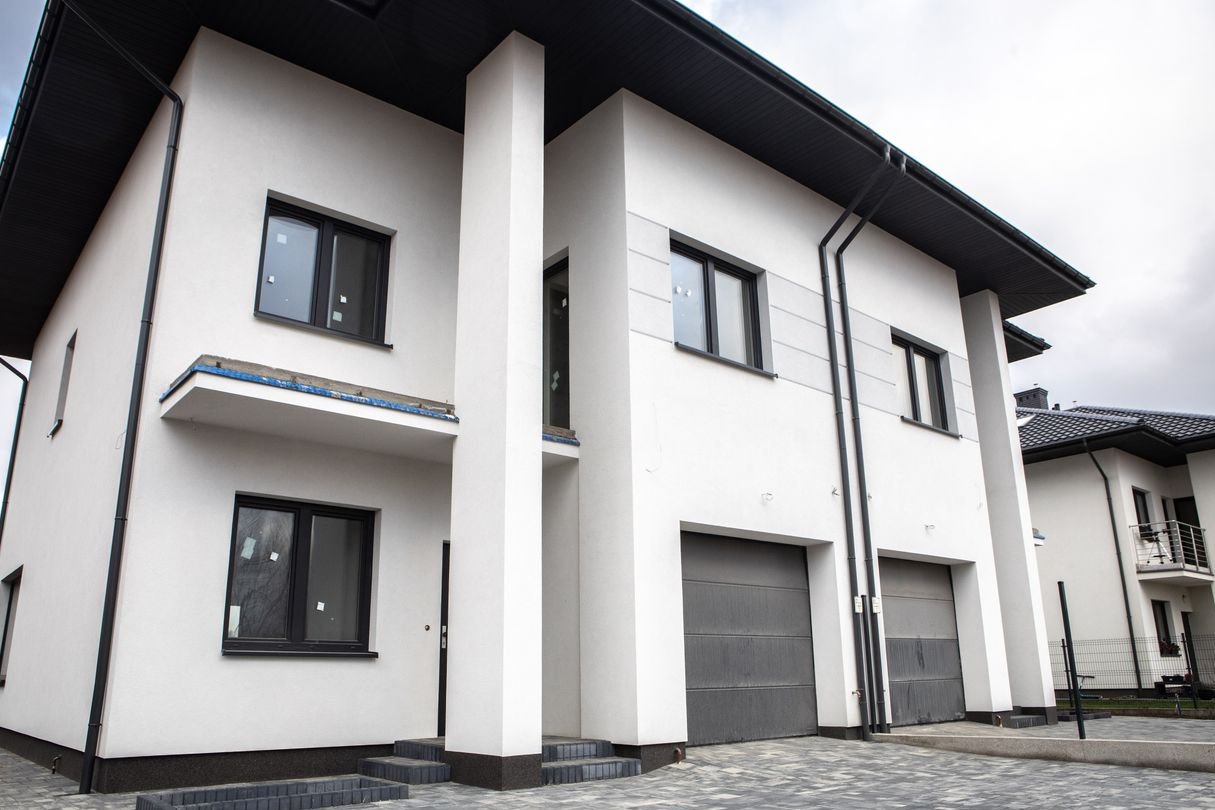 Dom w trakcie finalnych prac wykończeniowych do stanu deweloperskiego – z efektowną elewacją, ogrodzeniem i wykończonym już podjazdem z kostki.