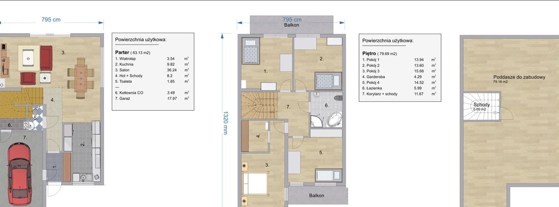 Powierzchnia użytkowa lokalu to: 139 m2 . Powierzchnia całkowita: 240 m2 (poddasze: 79 m2; garaż i kotłownia: 21 m2)