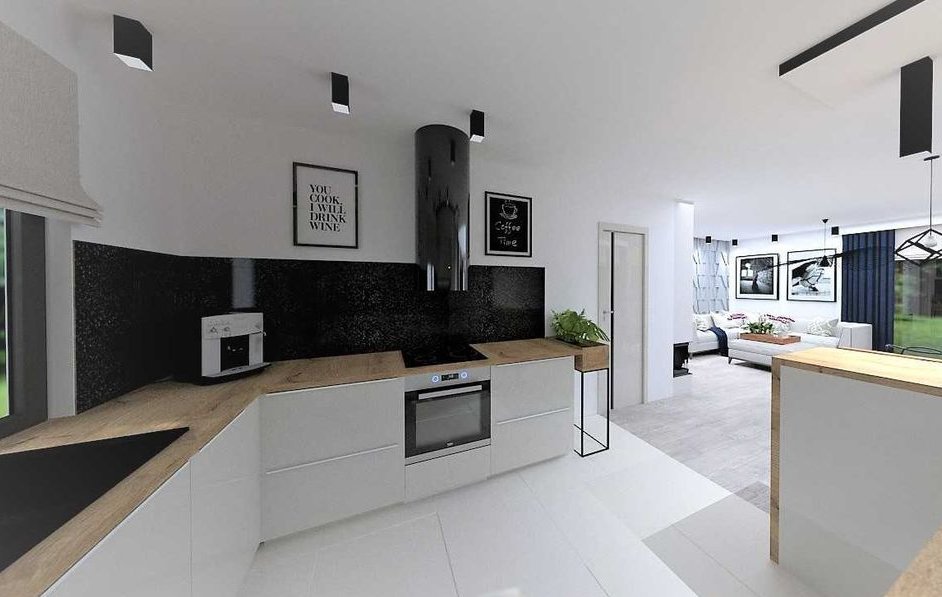 Do dyspozycji mieszkańców jest duży salon połączony z otwartą kuchnią, w sąsiedztwie której znalazła się praktyczna spiżarnia. Znajdują się tu ponadto 3 ustawne pokoje, łazienka, wc oraz kotłownia z wyjściem na zewnątrz