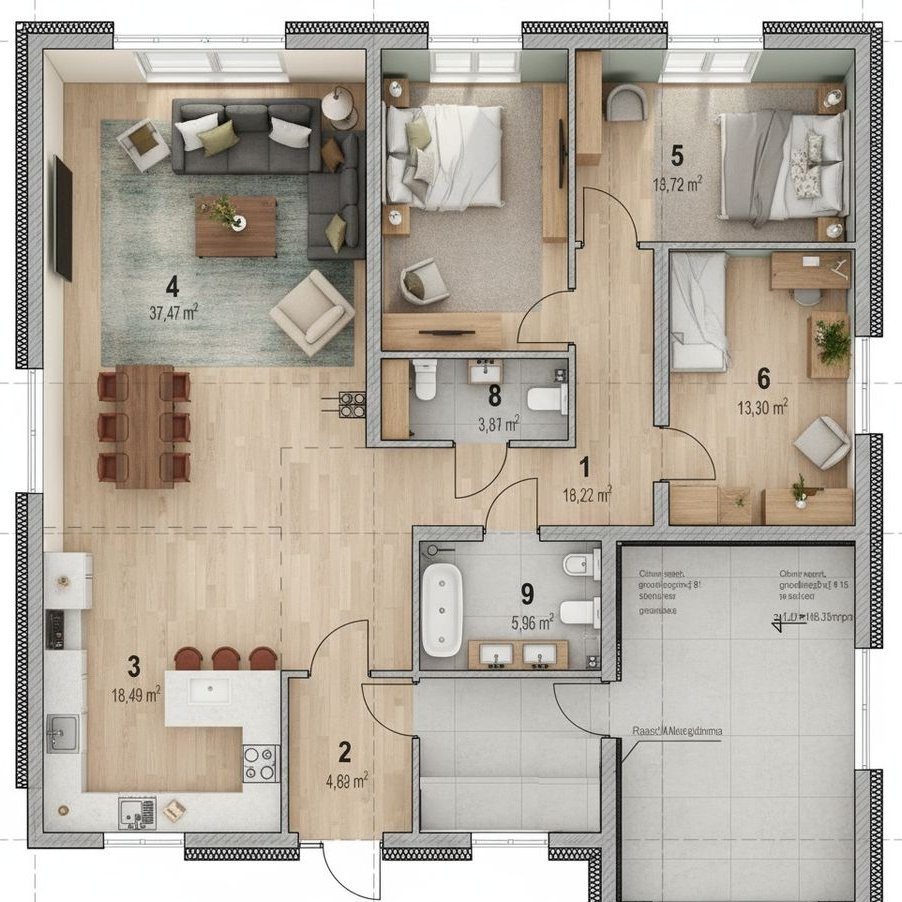 Powierzchnia użytkowa domu wynosi 126,06 m², a całkowita z garażem i kotłownią to 153,76 m². Dodatkowym atutem jest opcja adaptacji poddasza o powierzchni 50 m², która pozwala na stworzenie dodatkowej przestrzeni, np. domowego biura, pokoju rekreacyjnego lub dodatkowych sypialni.