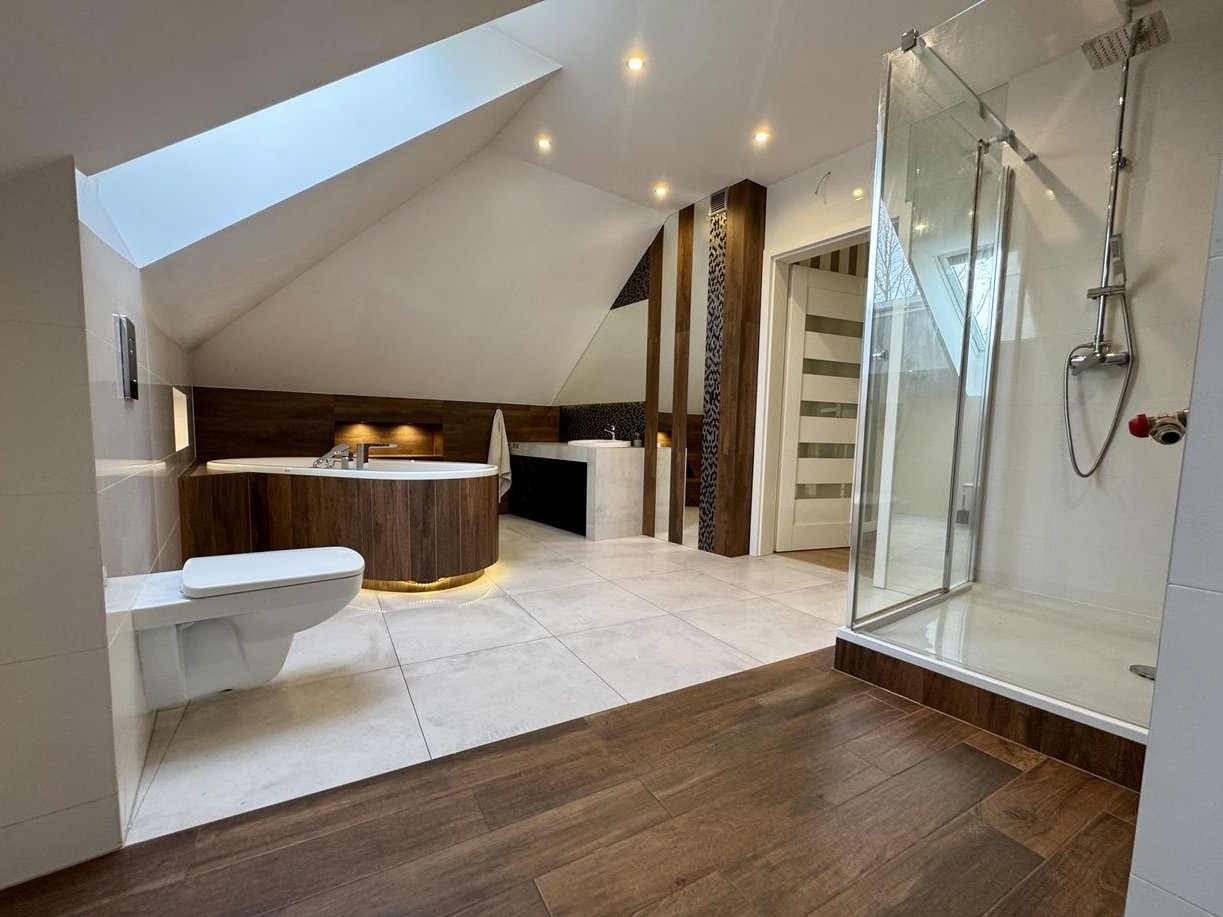W budynku podniesiona ściana na poddaszu, stąd powierzchnia rzeczywista jest większa o około 40 m2.