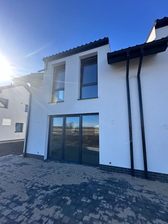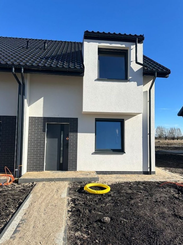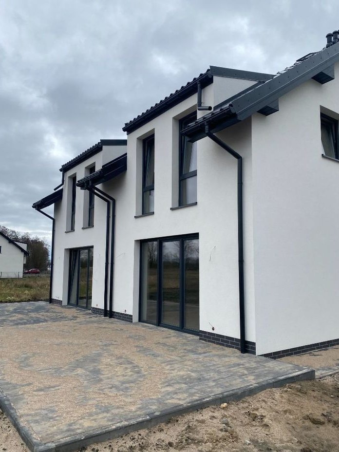 Dom w zabudowie bliźniaczej w stanie deweloperskim powierzchni użytkowej 90 m2 znajdują się na działce o powierzchni 1000 m2. Podjazd do domu wykonany z kostki brukowej.