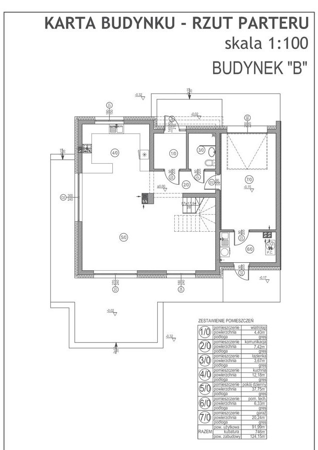 PARTER 91,99m2: garaż 20,24m2, komunikacja 7,42m2, wiatrołap 4,40m2, kotłownia 6,33m2, łazienka 3,67m2, salon z aneksem kuchennym i schodami 49,93m2.