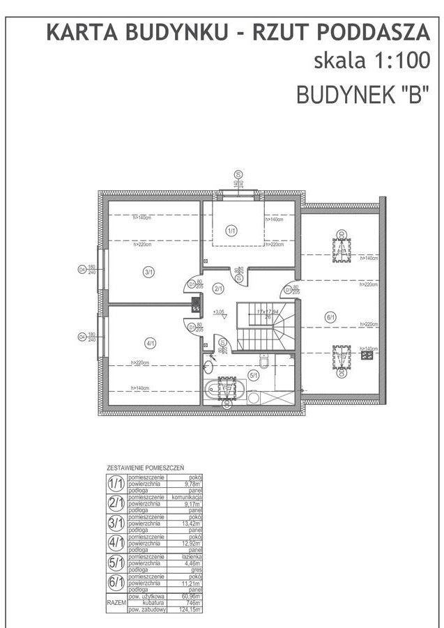 PIĘTRO 60,96m2(po posadzkach 91,99m2): pokój NR1 9,78m2(11,24), pokój NR2 13,42m2(18,06), pokój NR3 12,92m2(17,67), pokój NR4 11,21m2(26,9), łazienka 4,46m2(8,56), komunikacja9,17m2.