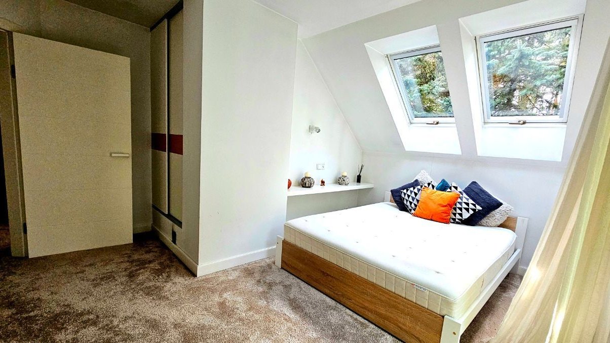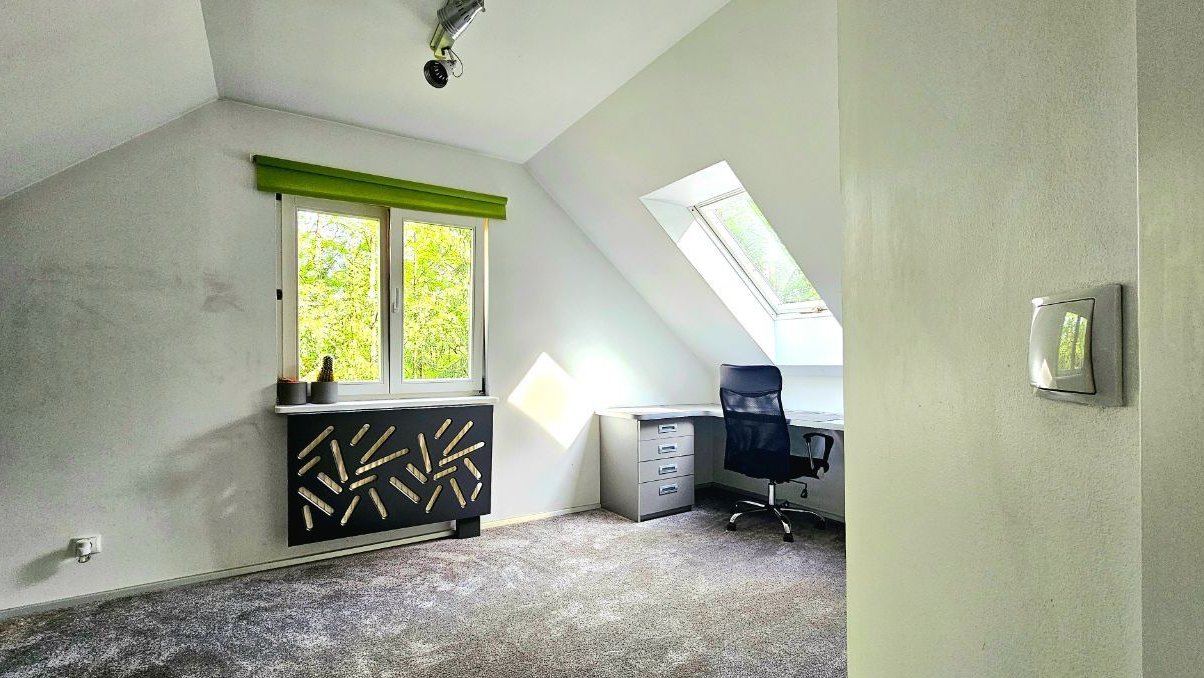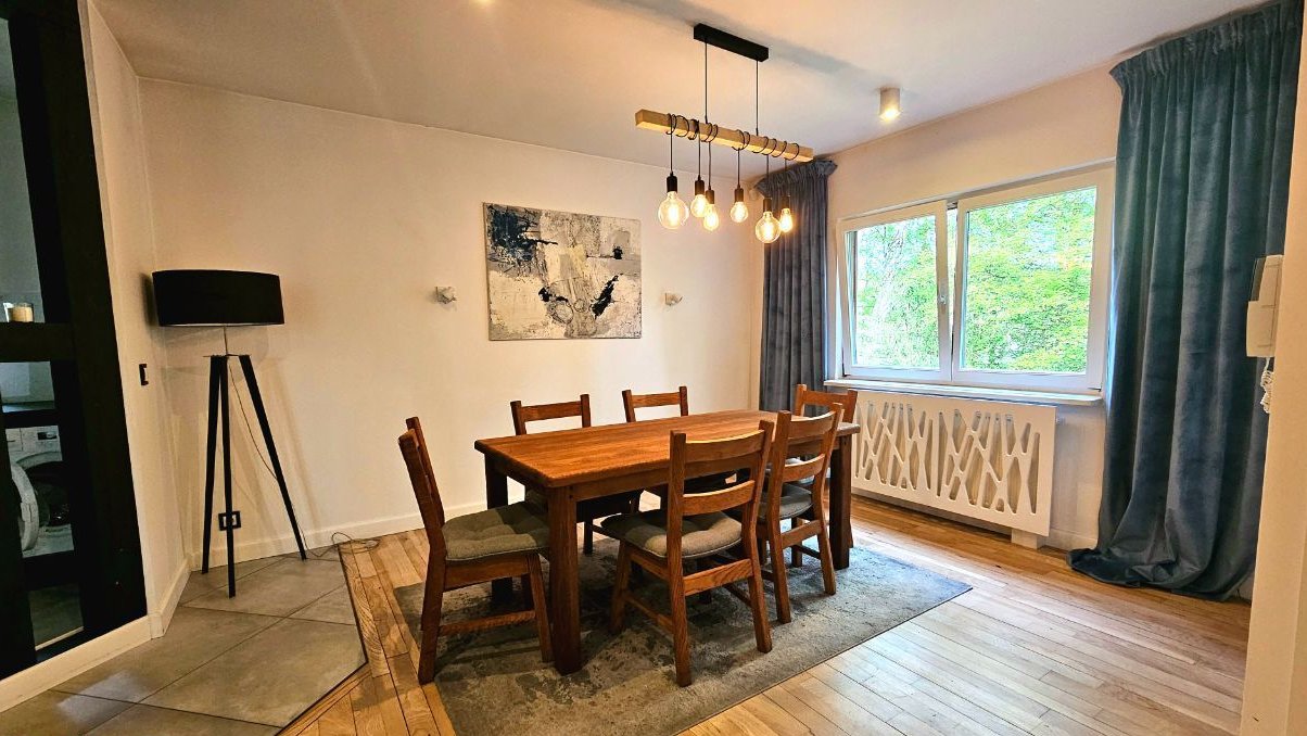 Parter jest dużą otwartą przestrzenią, w której znajdziemy przestronny salon z kominkiem urządzony w nowoczesnym stylu, połączony z jadalnią. Duża kuchnia wyposażona we wszystkie potrzebne sprzęty jest osobnym zamkniętym pomieszczeniem. Na pierwsze piętro prowadzą drewniane schody, gdzie znajdują się trzy duże, bardzo ustawne pokoje.