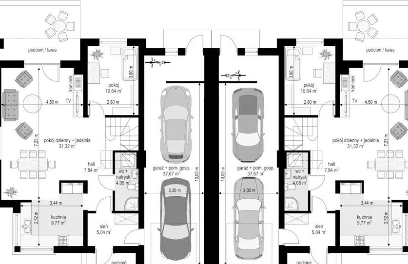 Każdy z domów posiada garaż mieszczący dwa auta+ trzecie na podjeździe
