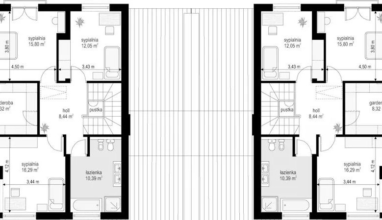 Całkowita powierzchnia użytkowa dla jednego domu w zabudowie bliźniaczej wynosi 178, 47m2., który znajduje się na działce o powierzchni 600m2,