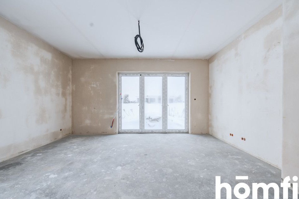 Przestronny salon z jadalnią (26,4 m²) z bezpośrednim wyjściem na ogród oraz miejscem pod drewnianą pergolę lub taras (z możliwością zadaszenia – przewidziane w projekcie).