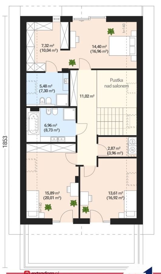 Strefa Prywatna (Piętro 77,55 m²): Aż 4 sypialnie, dwie pełne łazienki oraz praktyczna Pralnia (2,87 m²).