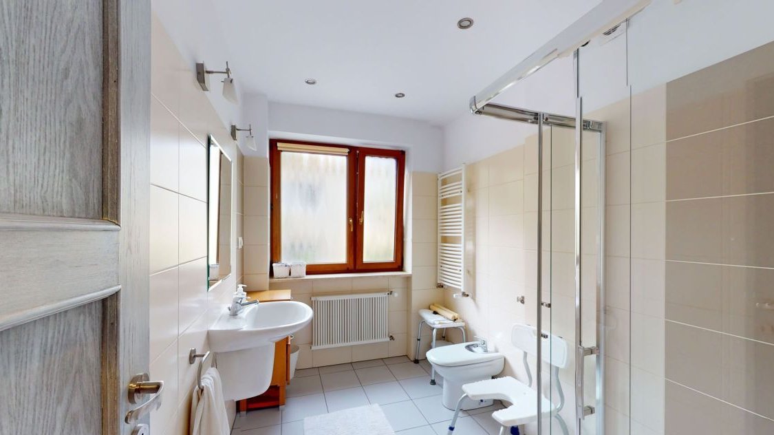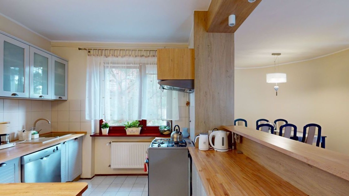 Podłogi drewniane (modrzew), w kuchni i w łazience płytki