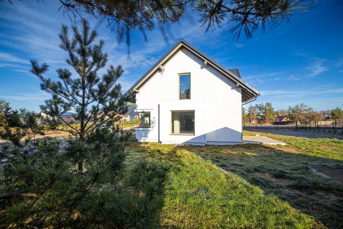 Dom ma duże okna o niskim współczynniku przenikania ciepła, wykonany jest z bloczka komórkowego ytong i wykończony materiałami najwyższej jakości, w energooszczędnej technologii. Dach pokryty jest modułową blachodachówką, a elewacja ocieplona grafitowym styropianem o grubości 20 cm.
